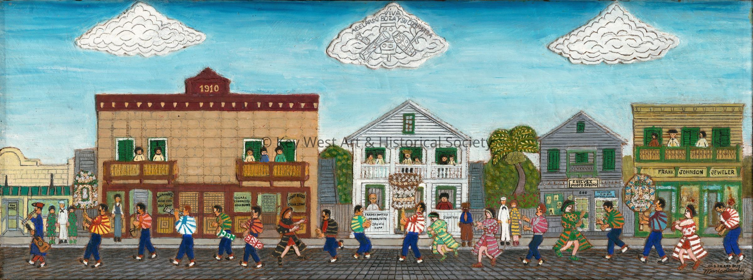 Wood carving by Mario Sanchez depicting Abelardo Boza and his comparsa dancers parading down the 600 block of Duval Street. Comparsa dancers pass Frank Johnson Jeweler, Estevez Photo Studio and a cigar manufacturer. 'Abelardo Boza y Su Comparsa' carved into center cloud. Created from two pieces of wood strapped together with smaller wood supports on verso.