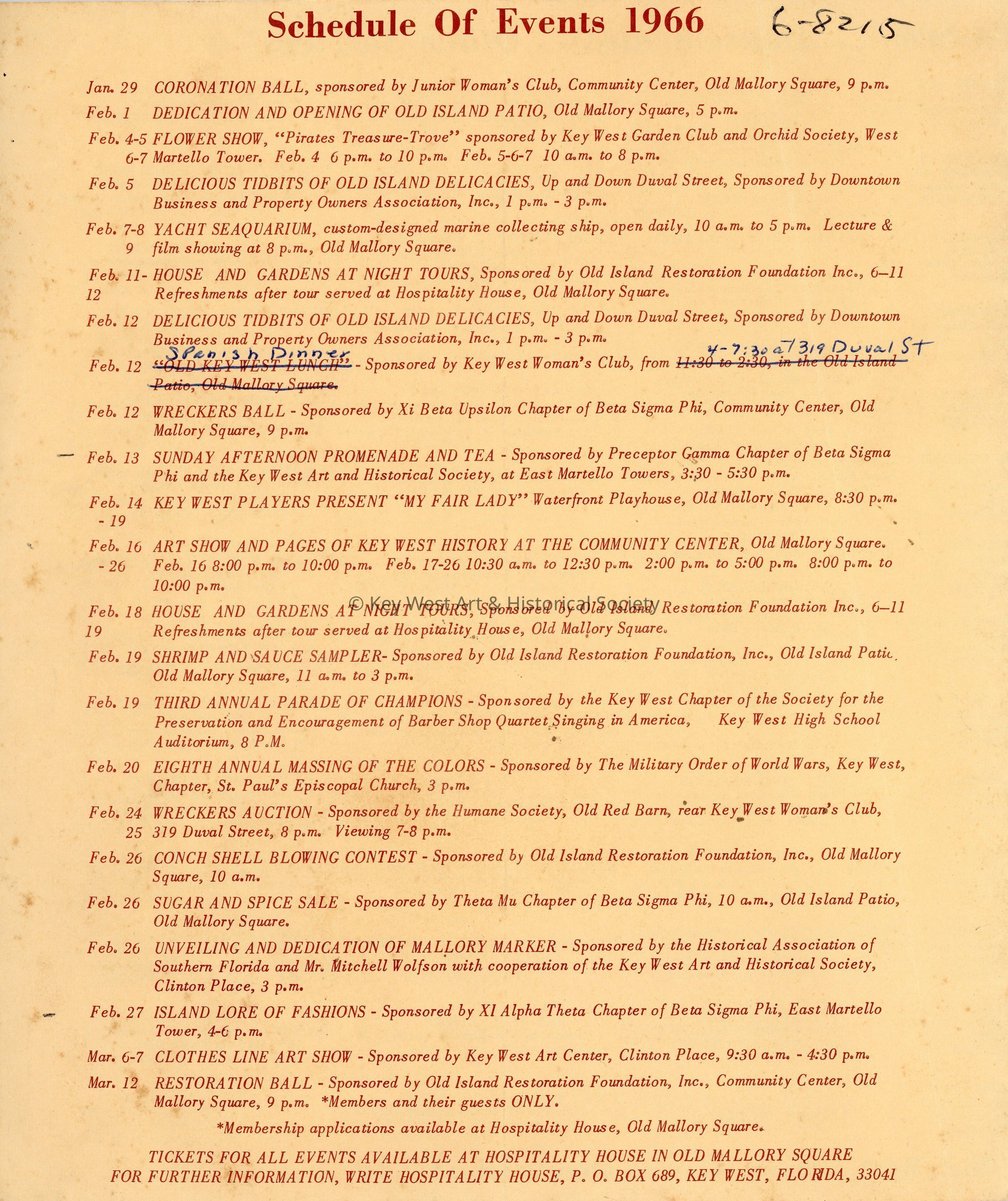 A pamphlet detailing the events of Old Island Days in Key West, held between January 29 and March 12, 1966, as presented by the Old Island Restoration Foundation. Events included a Coronation Ball, Flower Show, a presentation of 'My Fair Lady,' a Conch Shell Blowing Contest, and a Clothes Line Art Show amongst many others.Collection