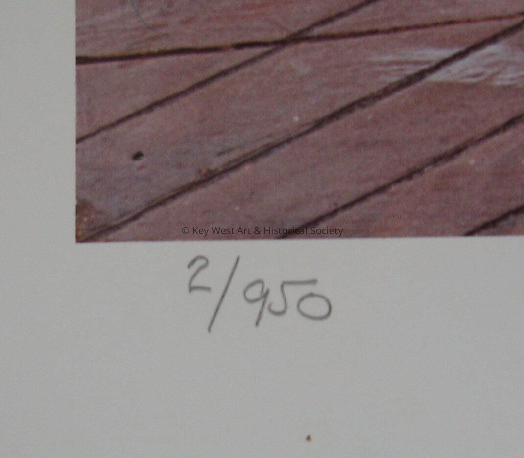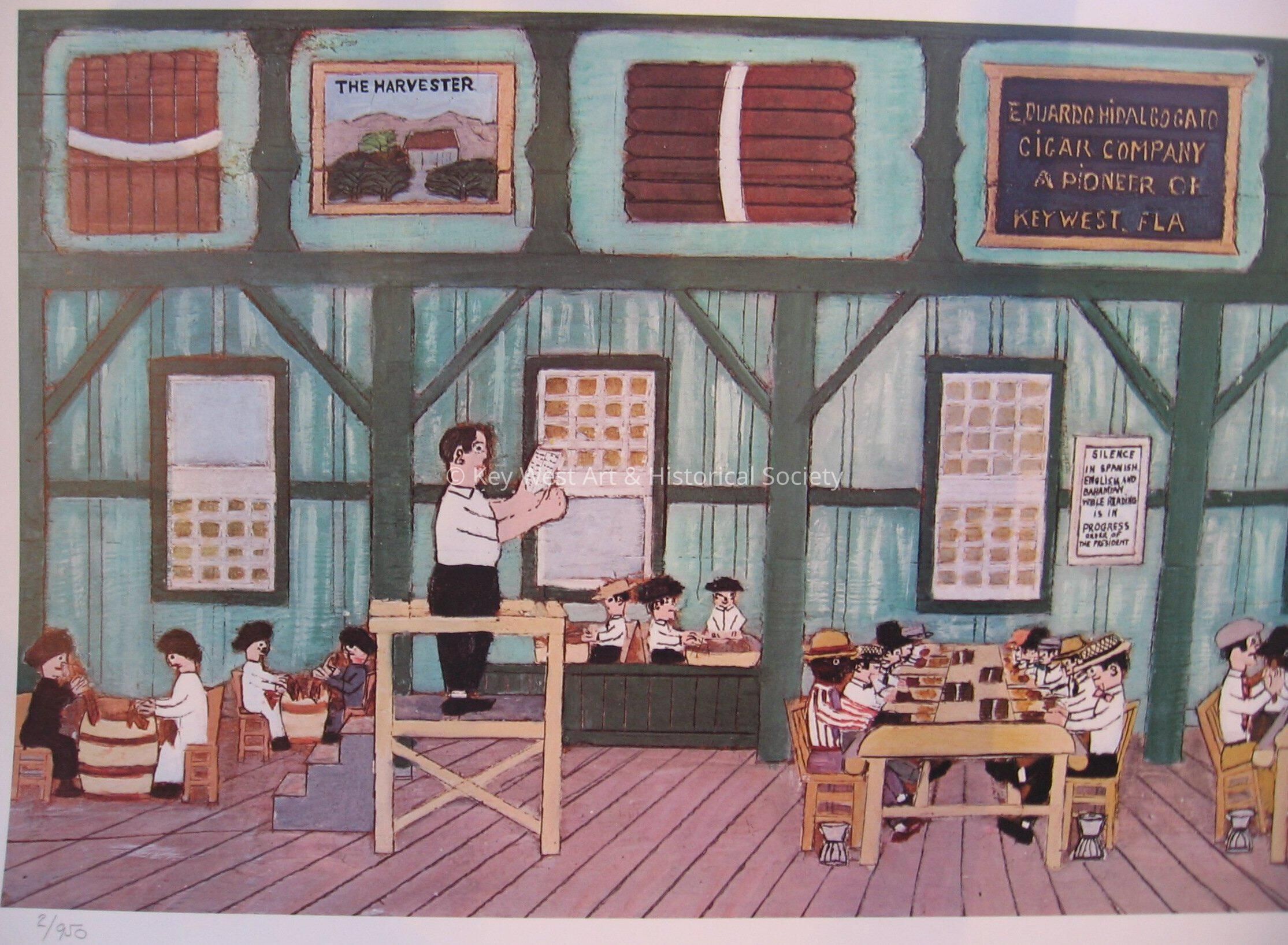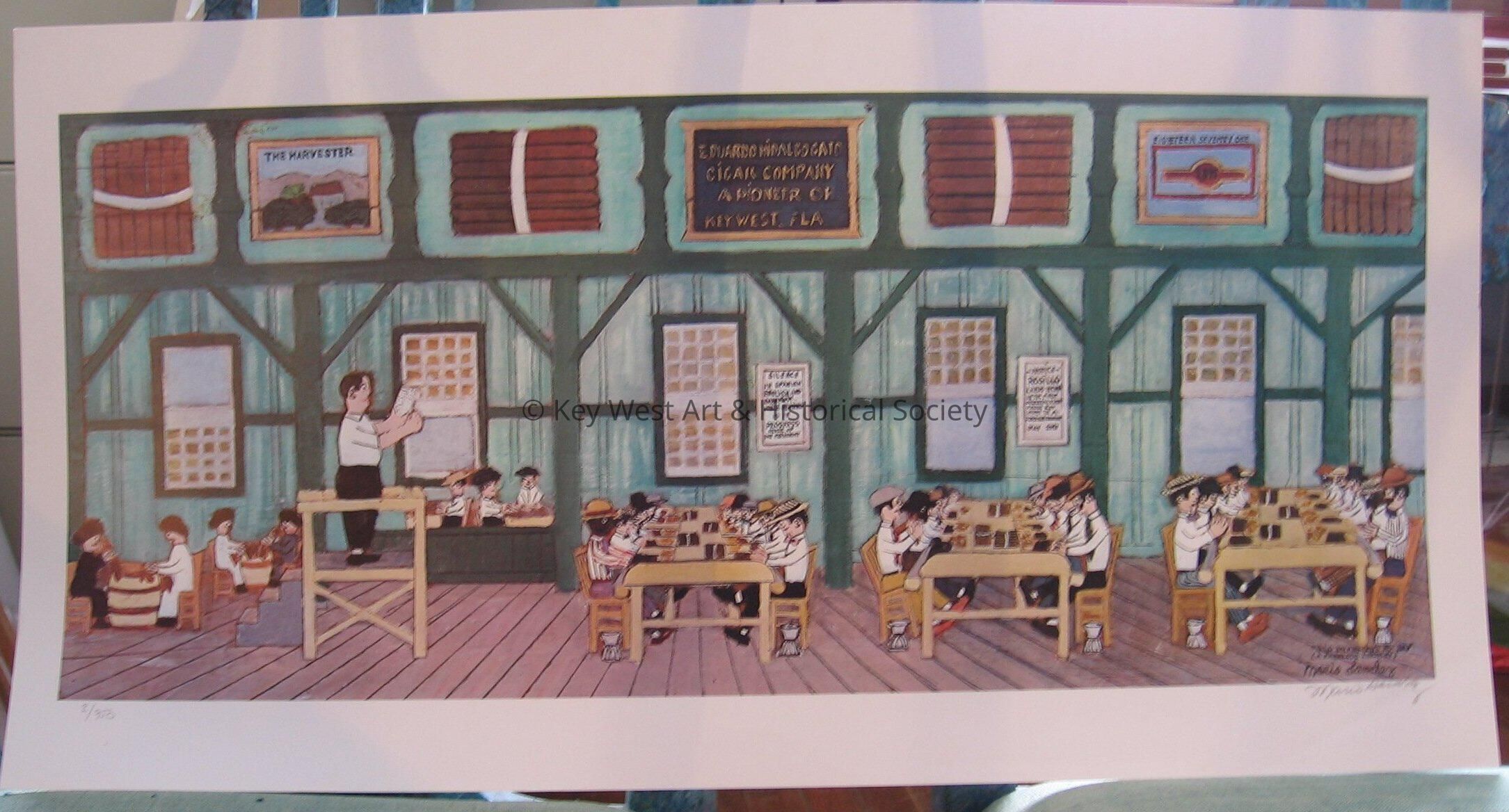 Signed and numbered print by Mario Sanchez. Numbered 2/950. Scene of Eduardo Hidalgo Gato Cigar Company. Workers are sitting at tables rolling cigars, on the left four people are sitting at barrels peeling cigar leaves, and a man is standing on a platform reading from a paper to the workers. Print is from Old Island Days #99 A Fabulous Industry 1987.01.3209Type of Print