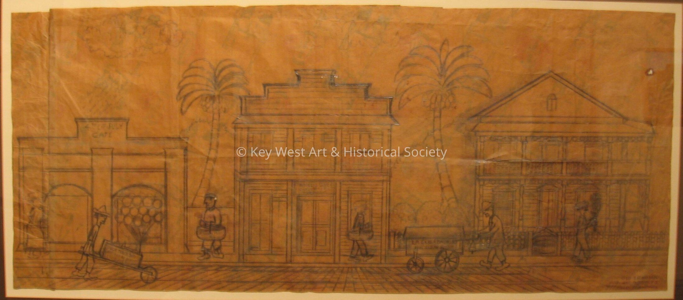 Paper bag drawing by Mario Sanchez depicting the 4th of July Cafe, Gomez Justice of the Peace, La Ceiba ambulant bakery.Type of Drawing