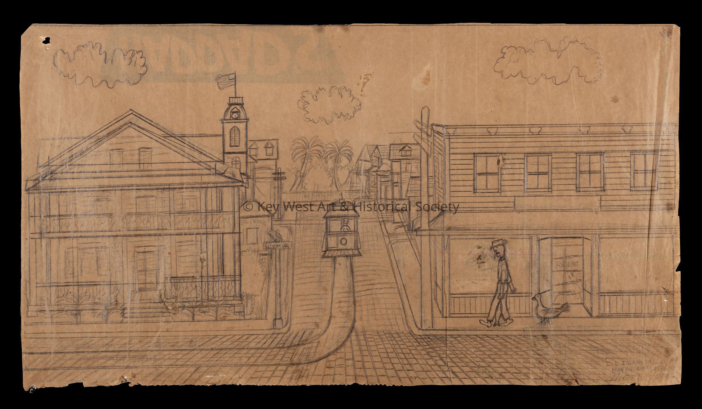 Pencil sketch on an unfolded paper bag by Mario Sanchez depicting a man and his goose walking toward the intersection of Simonton and Greene streets. Old City Hall and a Key West Street Car are seen in the background.Type of Drawing