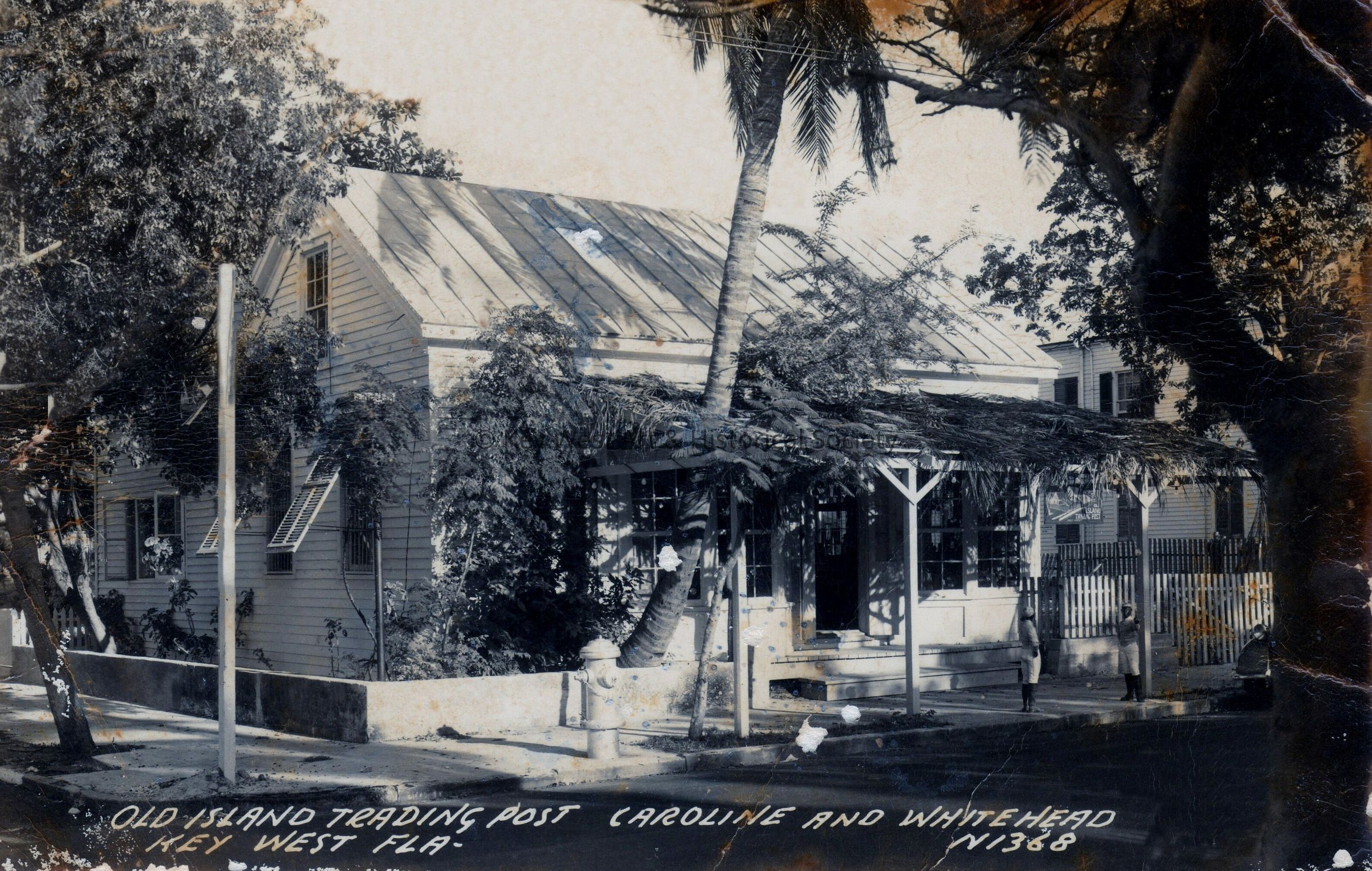 Postcard depicting a house with a covered front porch. The caption reads, ‘Old Island Trading Post, Caroline and Whitehead, Key West, Florida’.Subject Place