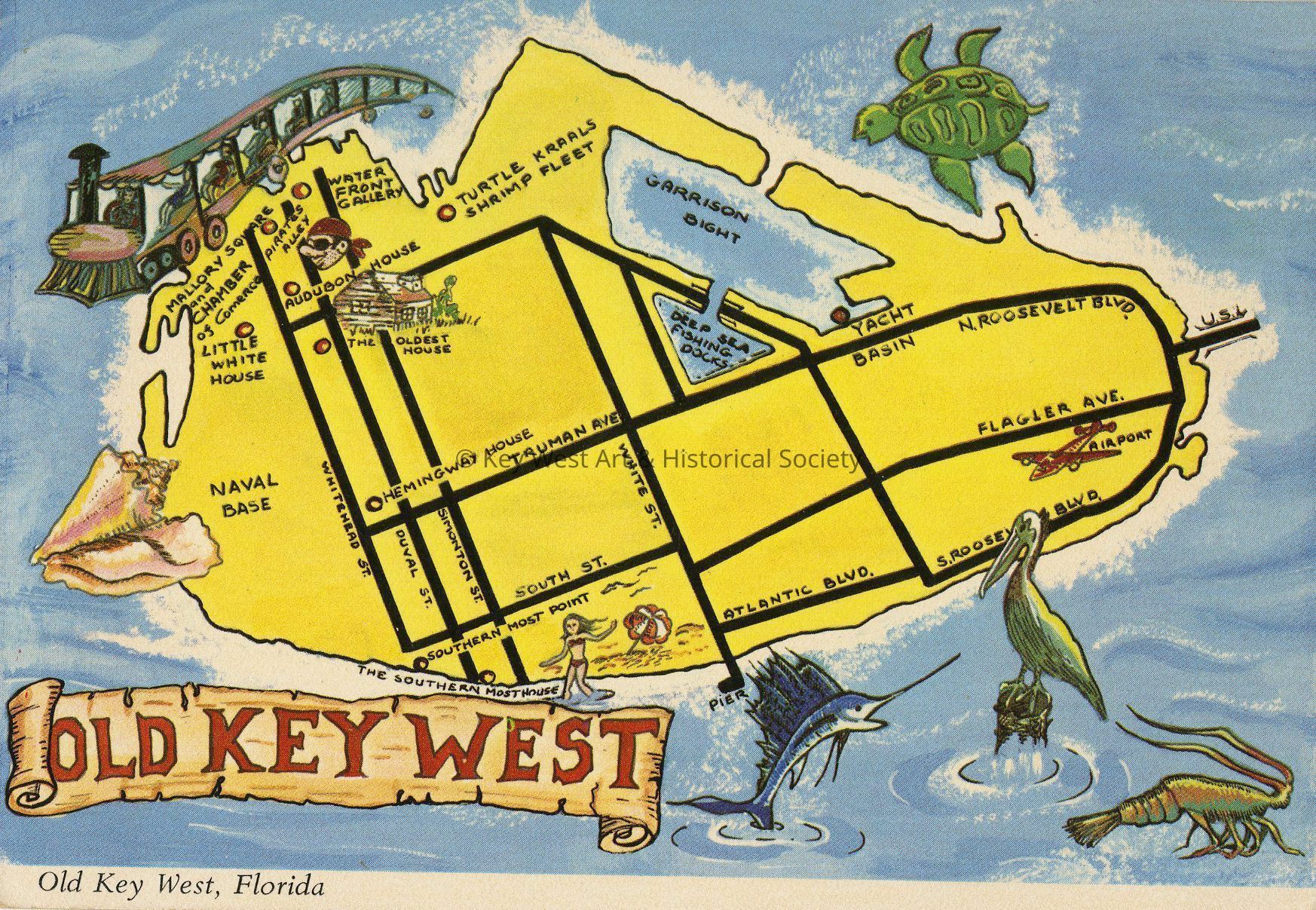 Color postcard depicting a hand drawn map of Key West highlighting it major thoroughfares and tourist destinations including Mallory Square, Little White House, Turtle Kraals, Garrison Bight and the Hemingway House. Notation on verso, 'This map of key West shows some of the main streets and points of interest for the visitor.'Subject Place