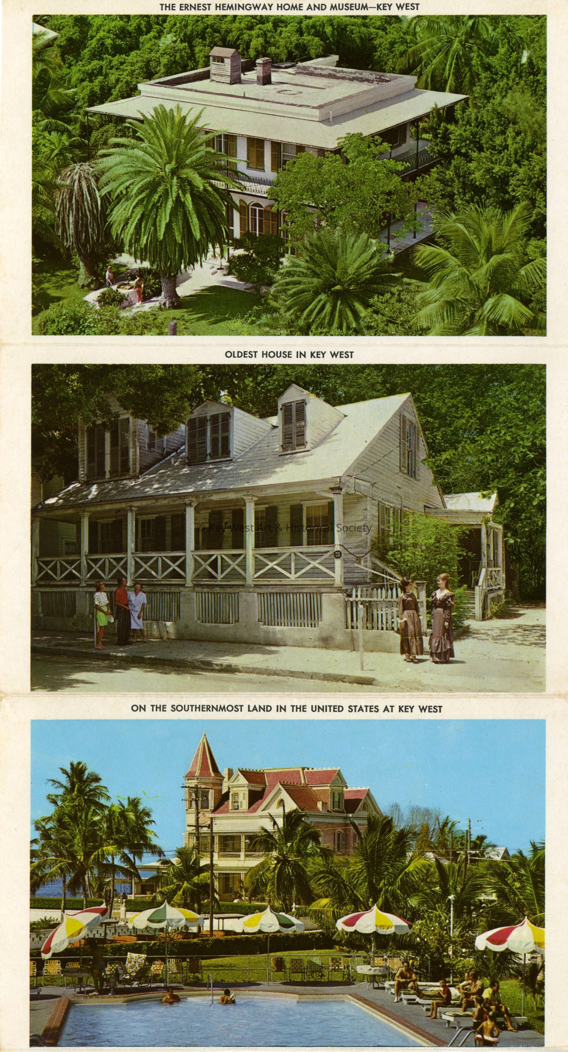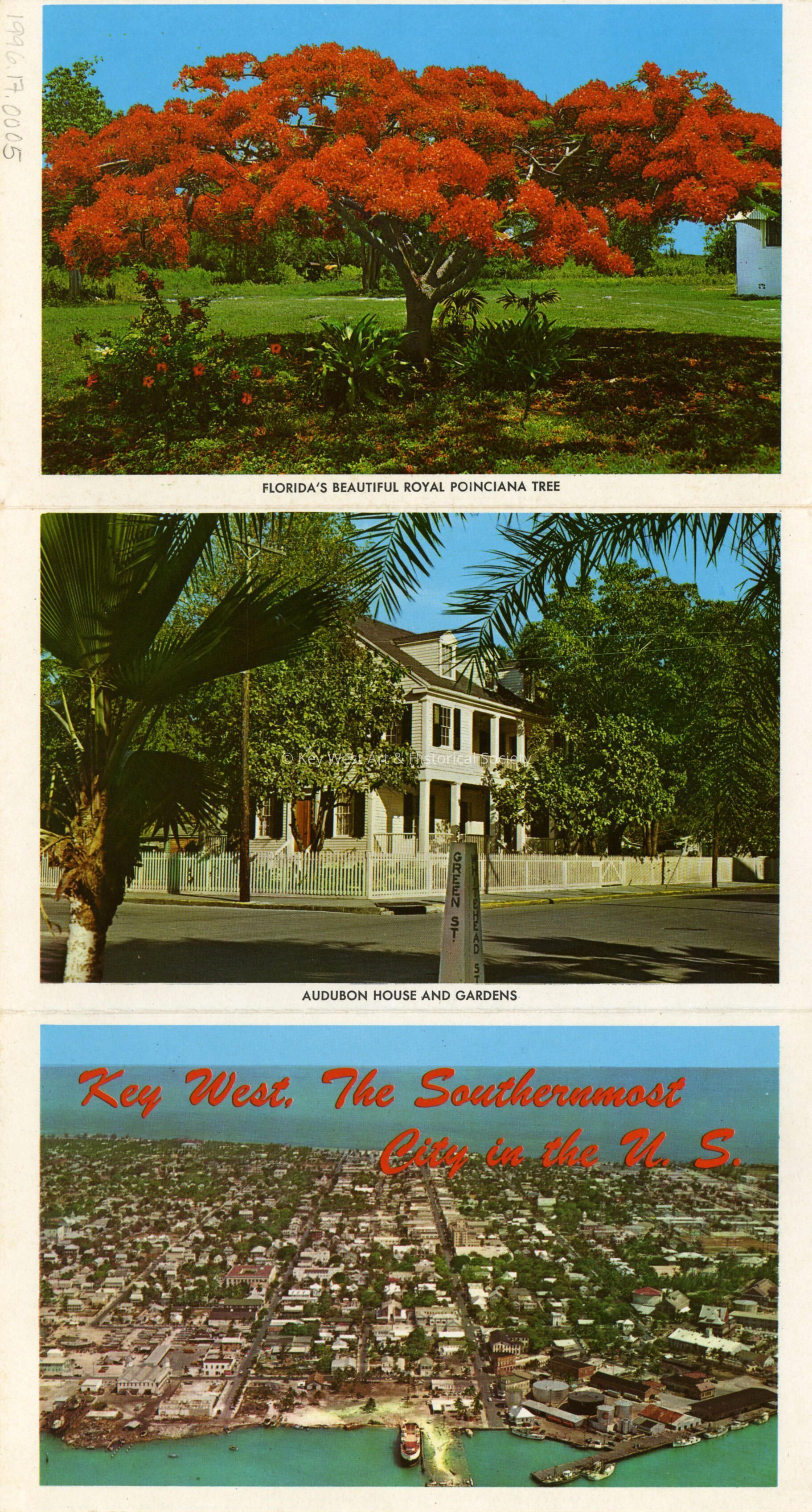 Section of souvenir postcard folder featuring images in and around Key West including the Ernest Hemingway Home, the Oldest House, the Southernmost House, a Royal Poinciana Tree and the Audubon House. Postcards in the interior were separated and is now in two pieces.Subject Place