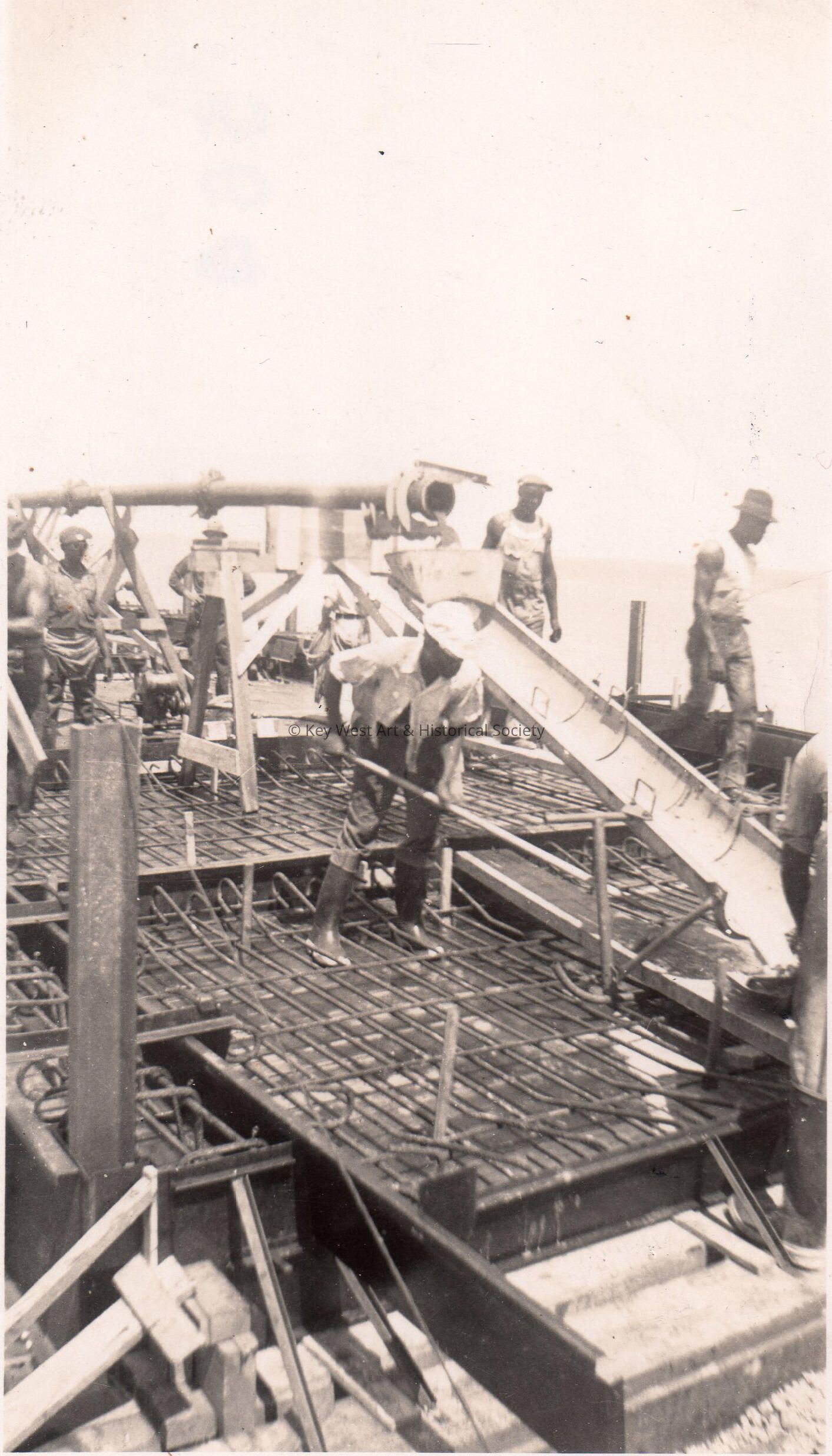 Black and white photograph of construction workers pouring concrete on the old Seven Mile Bridge in preparation for the Overseas Highway.