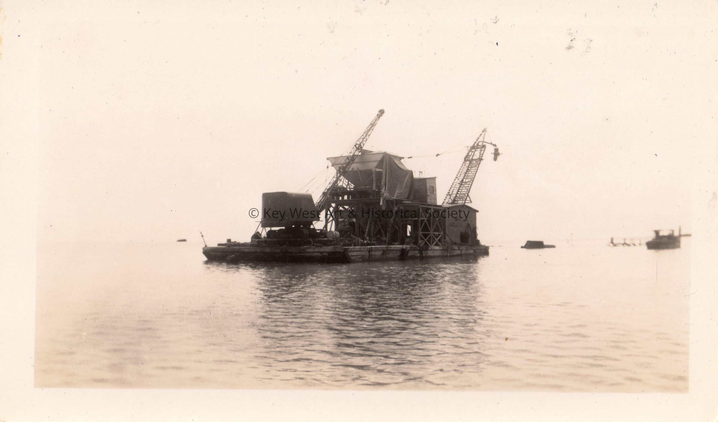 Old Seven Mile Bridge construction in the 1930s - barge with crane.Collection