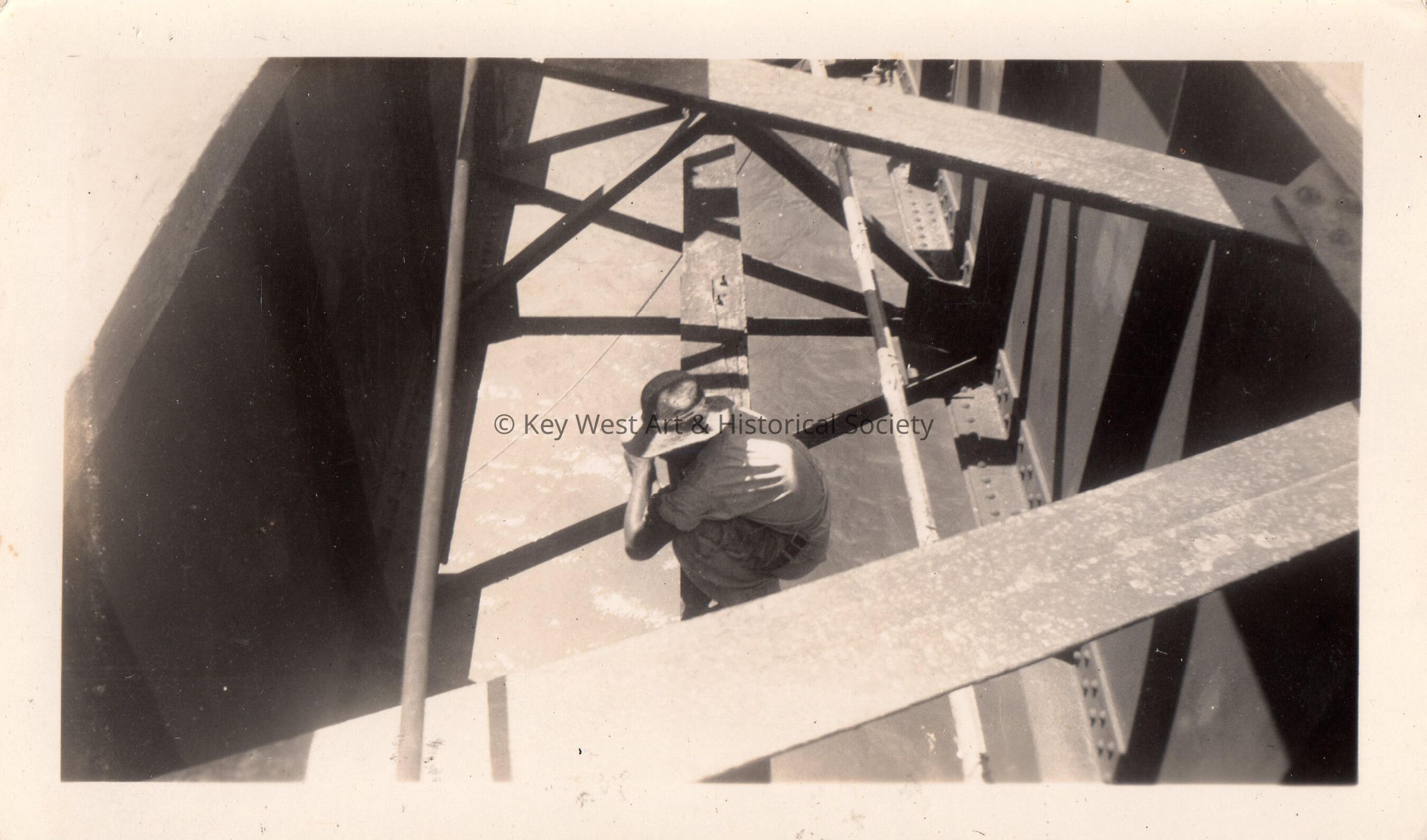 Old Seven Mile Bridge construction in the 1930s -unknown man on girder.Collection
