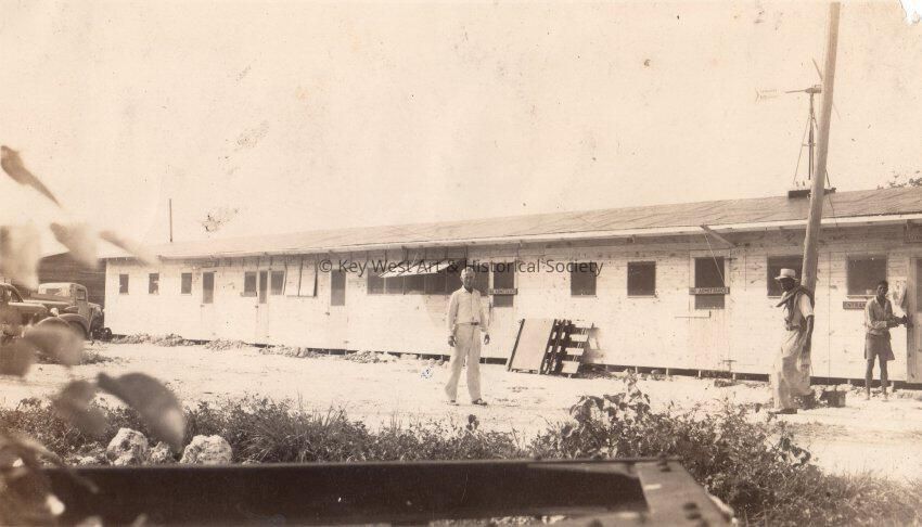 Old Seven Mile Bridge construction in the 1930s - workers outside building.Collection