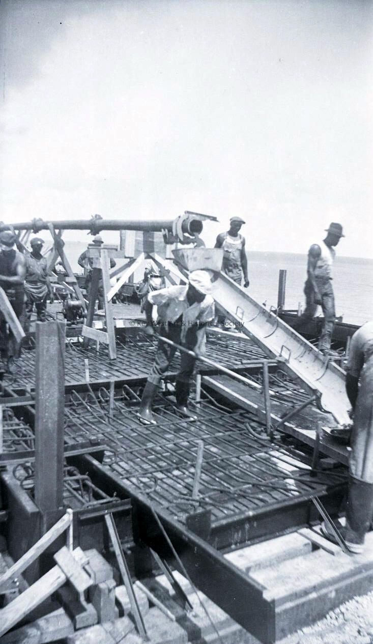 Black and white negative of construction workers pouring concrete on the old Seven Mile Bridge in preparation for the Overseas Highway.