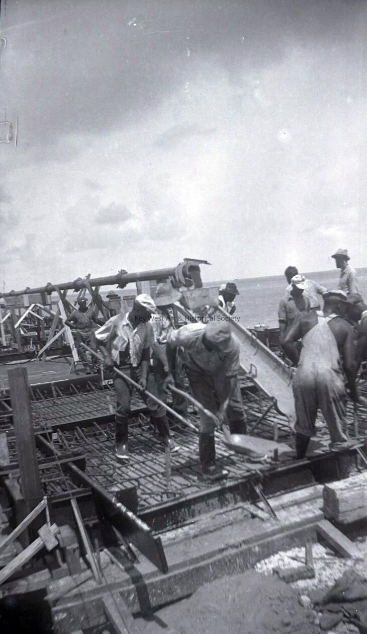 Black and white negative of construction workers pouring concrete on the old Seven Mile Bridge in preparation for the Overseas Highway.