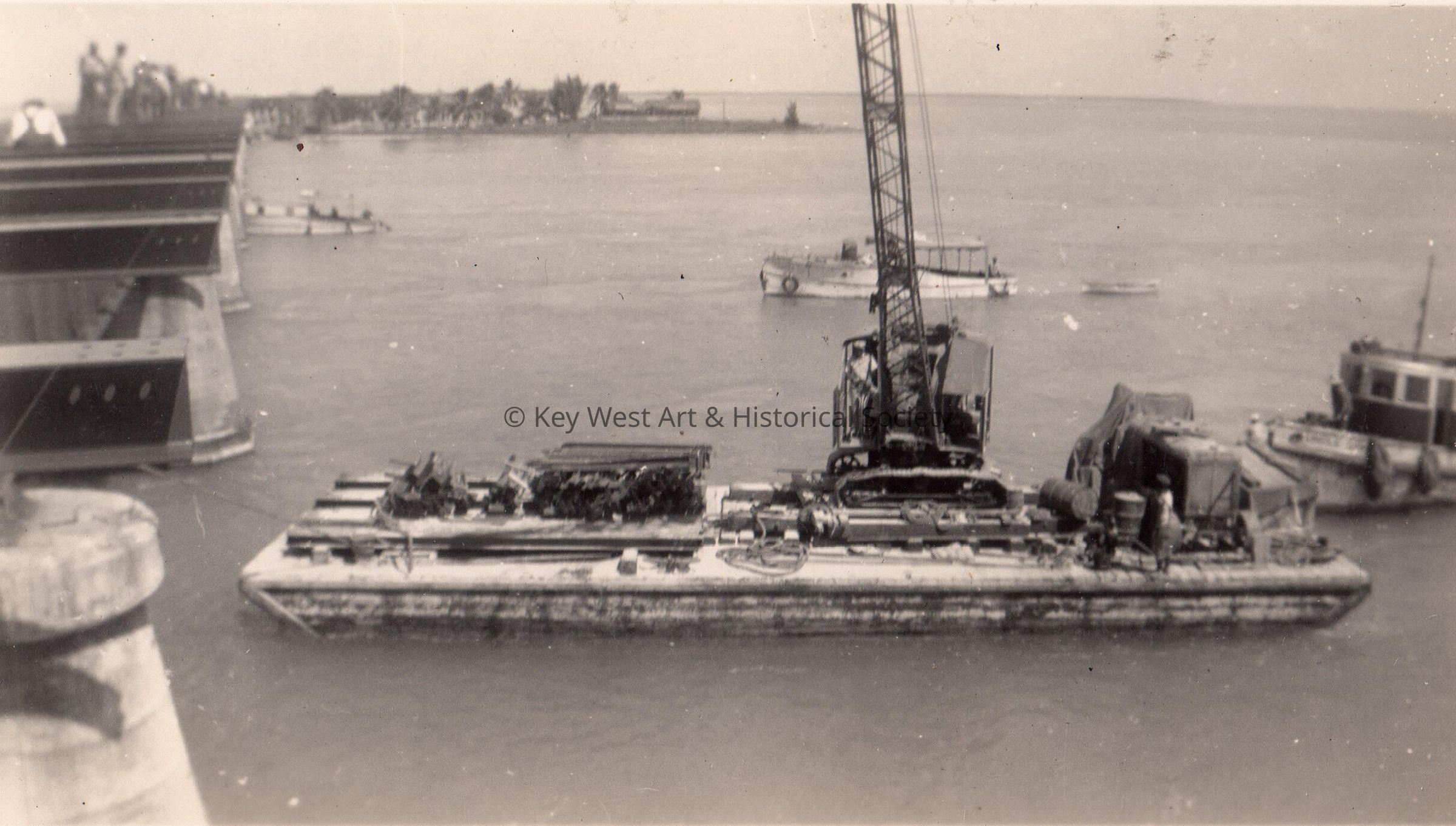 Old Seven Mile Bridge construction in the 1930s - barge with crane.Collection