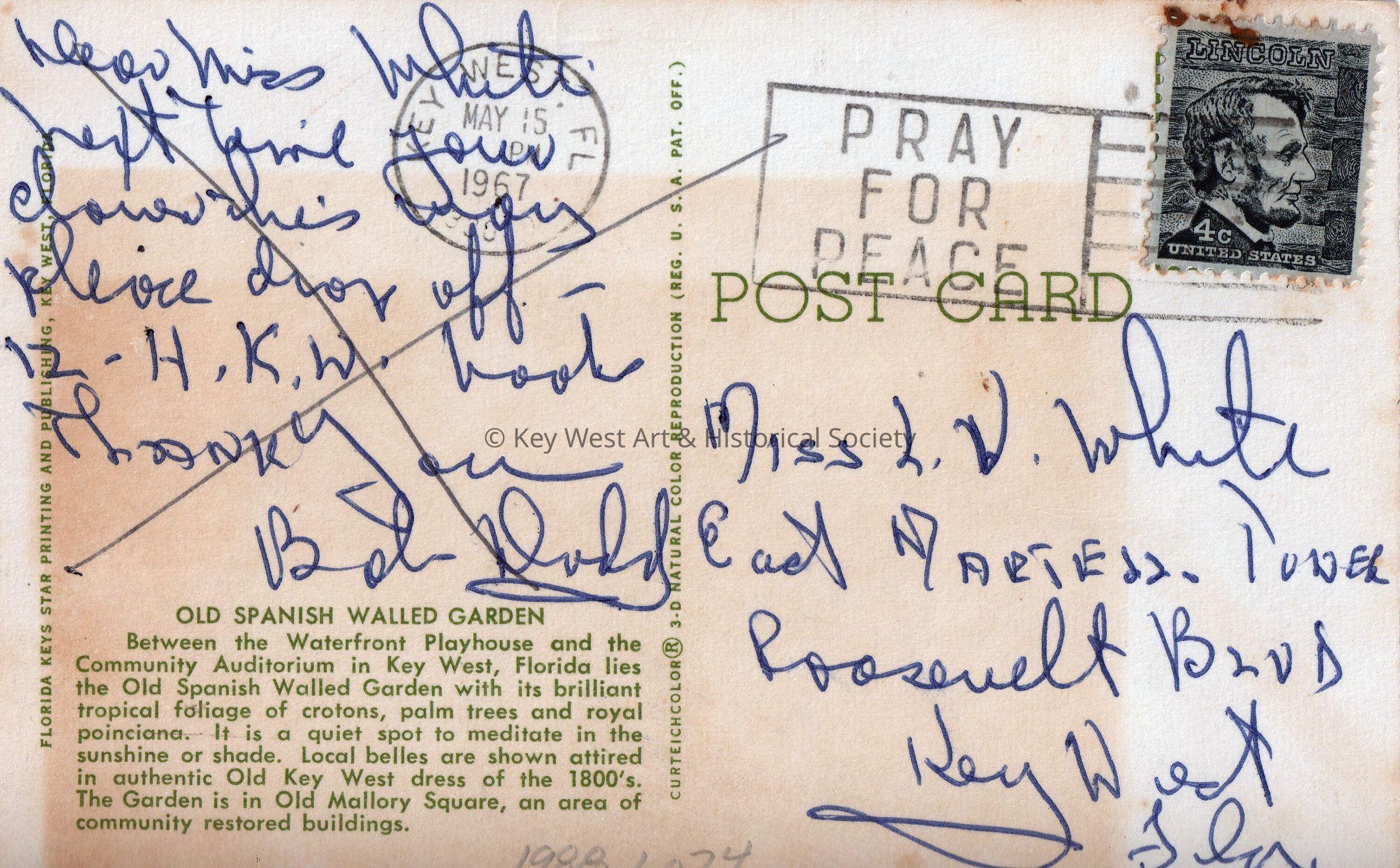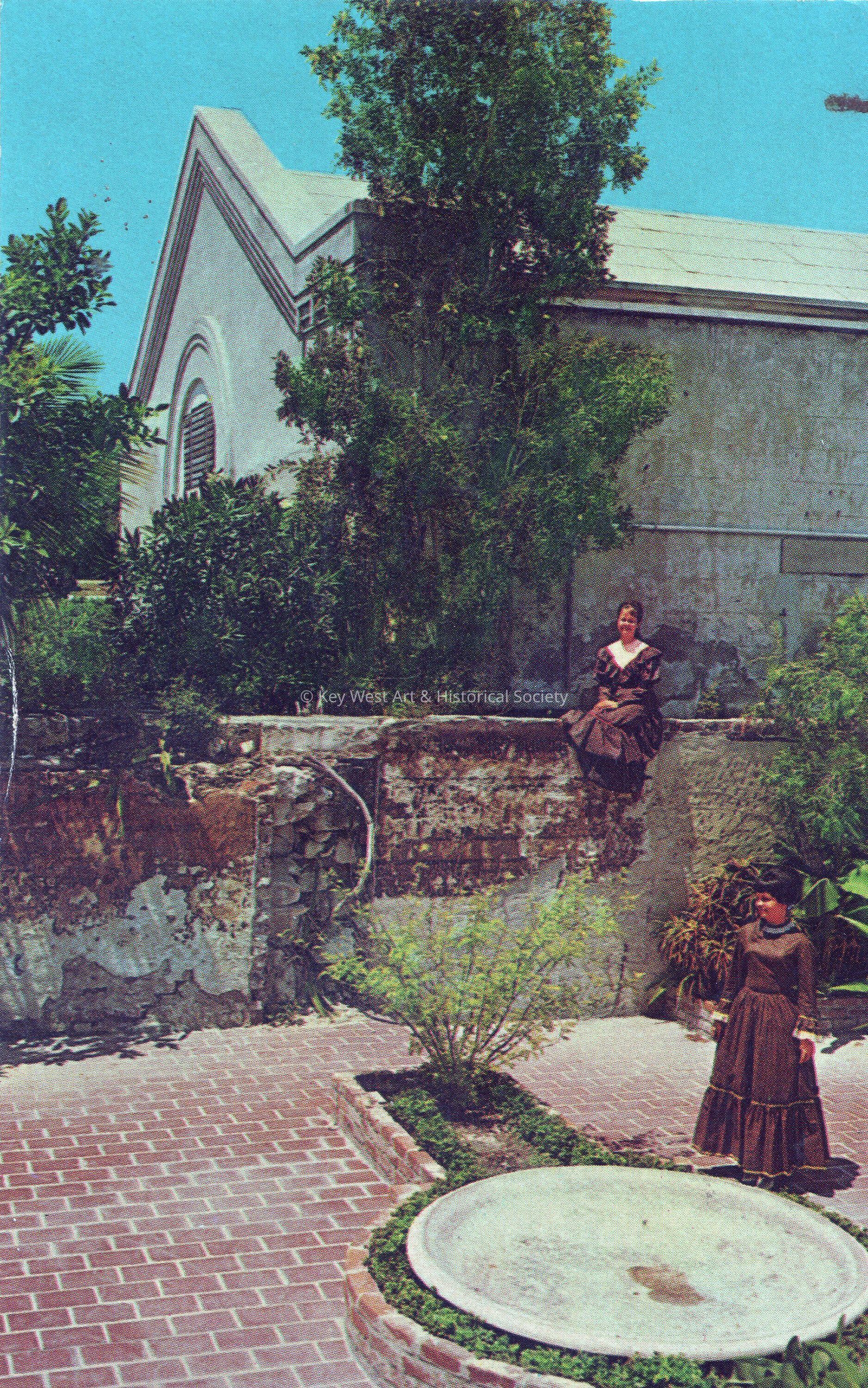 Postcard depicting women in period clothes near a walled garden. The description on the verso reads, ‘Old Spanish Walled Garden. Between the Waterfront Playhouse and the Community Auditorium in Key West, Florida, lies the Old Spanish Walled Garden with its brilliant tropical foliage of crotons, palm trees and royal Poinciana. It is a quiet spot to meditate in the sunshine or shade. Local belles are shown attired in authentic Old Key West dress of the 1800’s. The Garden is in Old Mallory Square, an area of community restored buildings.' The message on the verso reads, ‘Dear Miss White, Next time you’re down this way please drop off 12 H.S.W. books. Thank you, Bob Dodd’. The card is addressed to Miss L. V. White, East Martello Tower, Roosevelt Boulevard, Key West, Florida, and is postmarked Key West, May 15, 1967.Collection