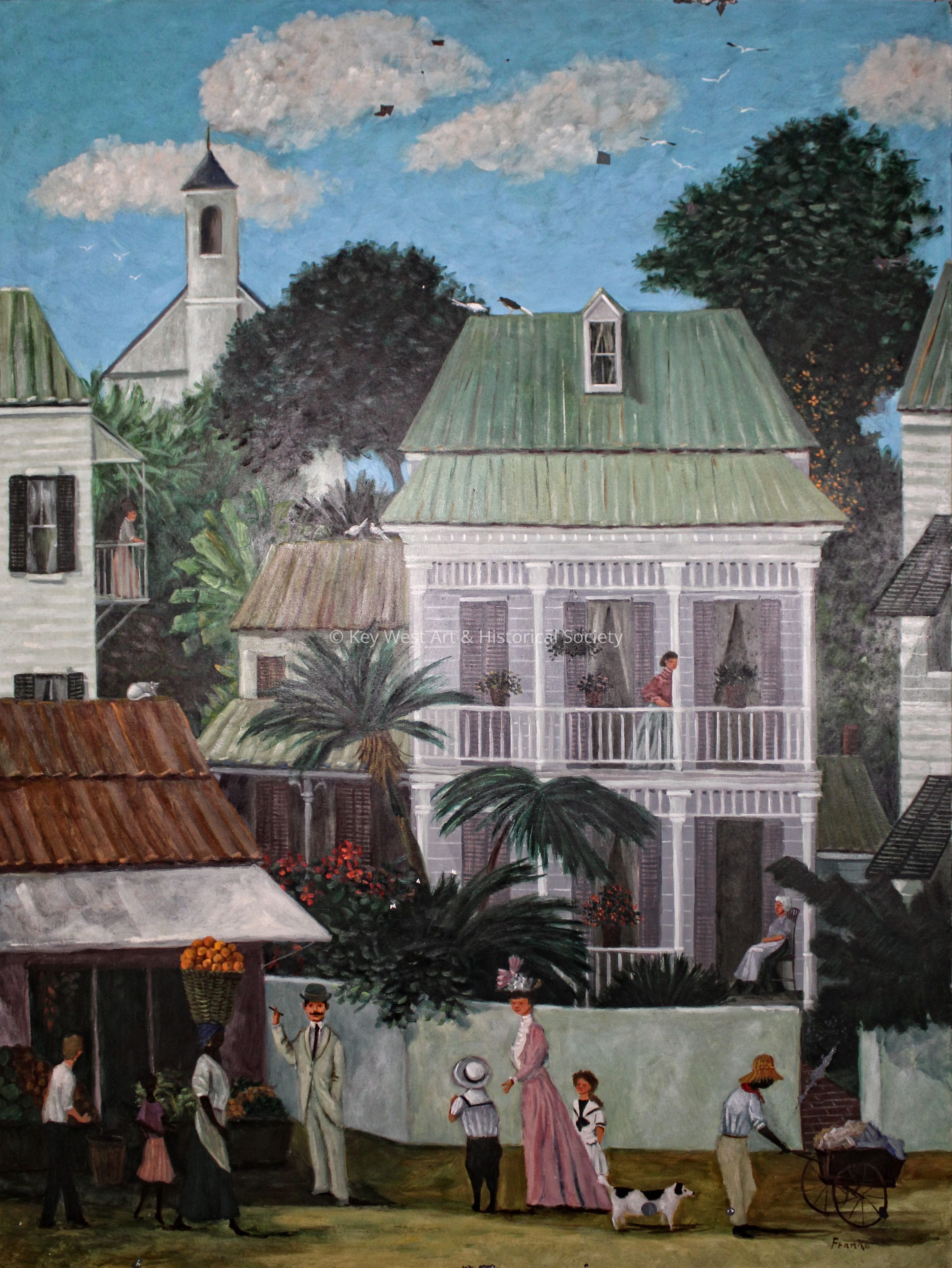Oil on canvas painting by Robert Franke depicting a vibrant and imaginative Key West street scene with various people engaged in daily activities in front of quaint houses. The foreground features a group of elegantly dressed individuals including women in long dresses and men in suits and hats, interacting near a market stall laden with fruit. To the right, children play near a small dog, adding a sense of liveliness to the scene. The background shows several large houses with green gabled roofs and white balconies, surrounded by tropical plants. A church with a bell tower rises behind the foliage, and the sky above is painted in a pale blue, dotted with fluffy white clouds and birds in flight.Type of Painting
