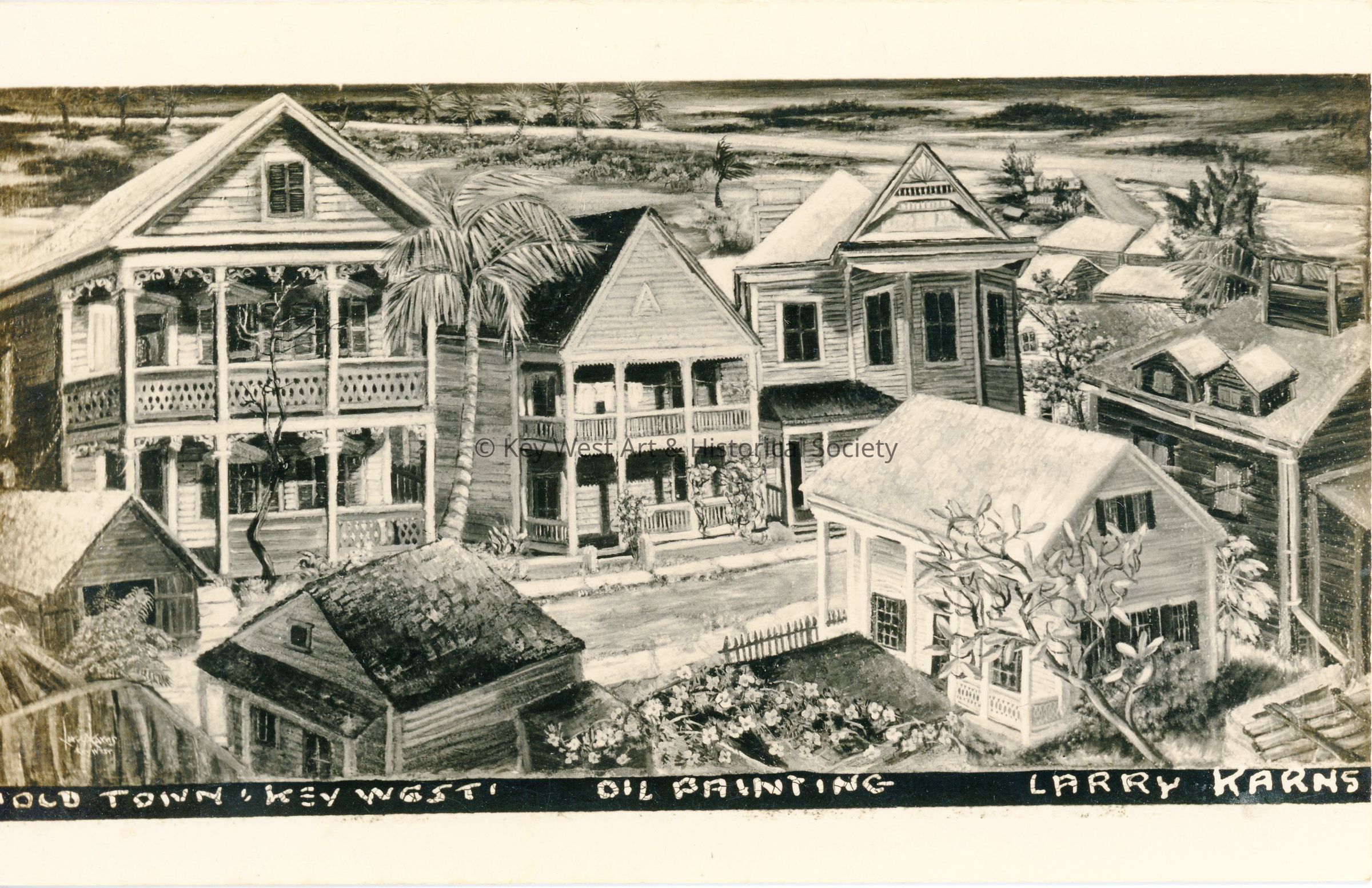 Postcard depicting 'Old Town Key West,' an oil painting by Larry Karns featuring houses of Key West.Subject Place
