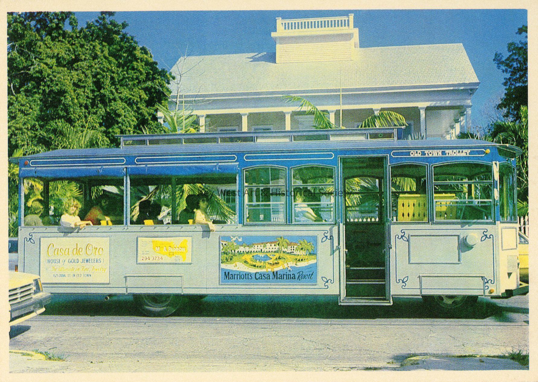 Color postcard depicting the Old Town Trolley on Southard Street. Notation on verso, 'The old town trolley operates in old and new sections and quaint lanes of Key West. It is pictured here in front of the Captain John Lowe home on Southard Street. The trolley is a motorized replica of the electric streetcars which once ran through the town. Among the places visited are old homes and shops areas shrimp docks, museums, cemetery and the new boulevard areas.'Subject Place