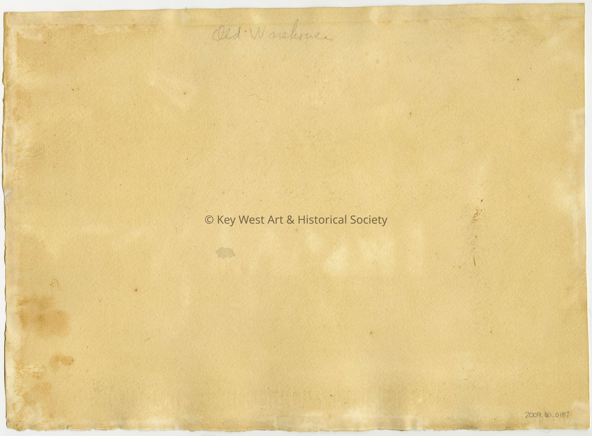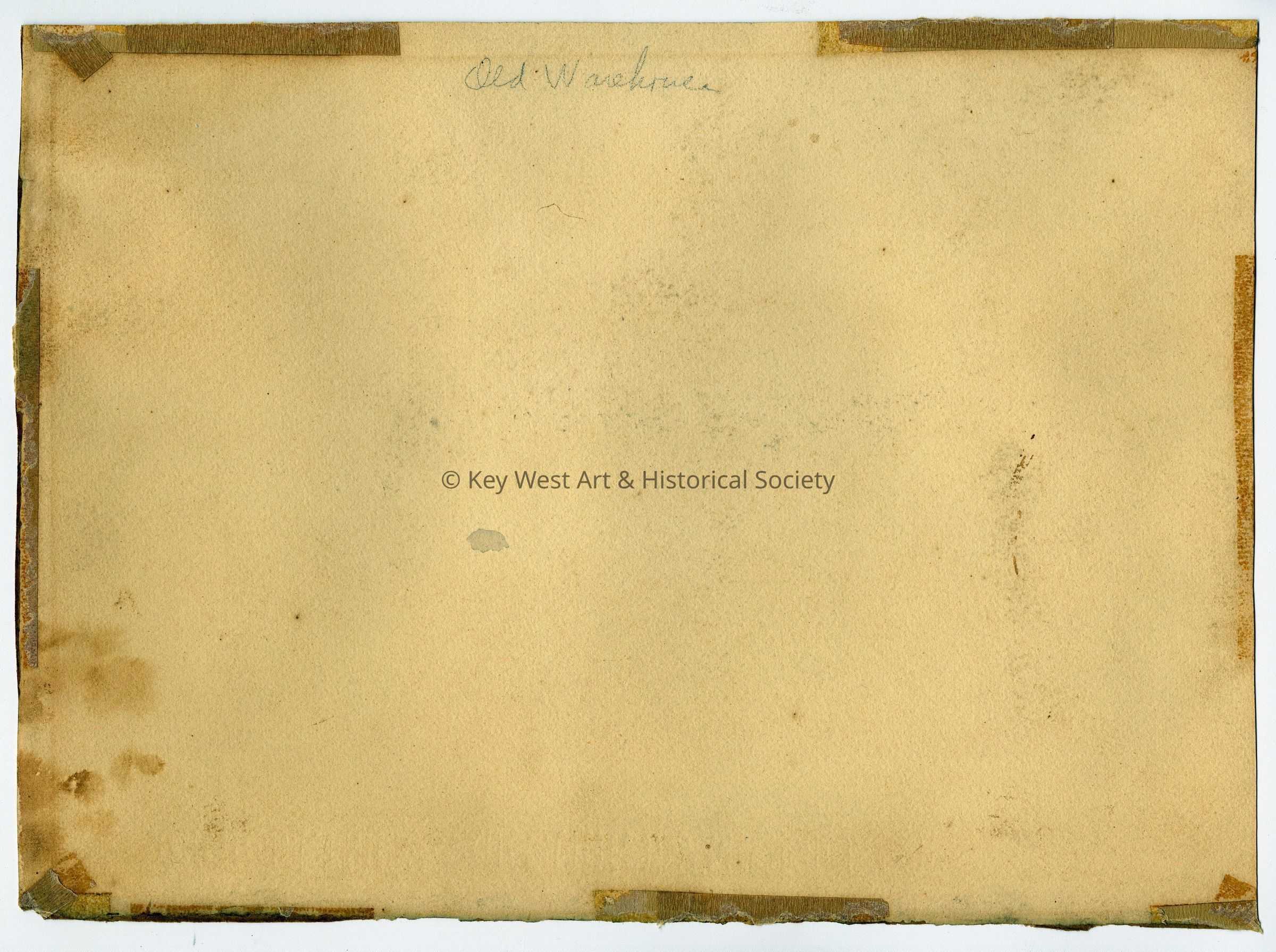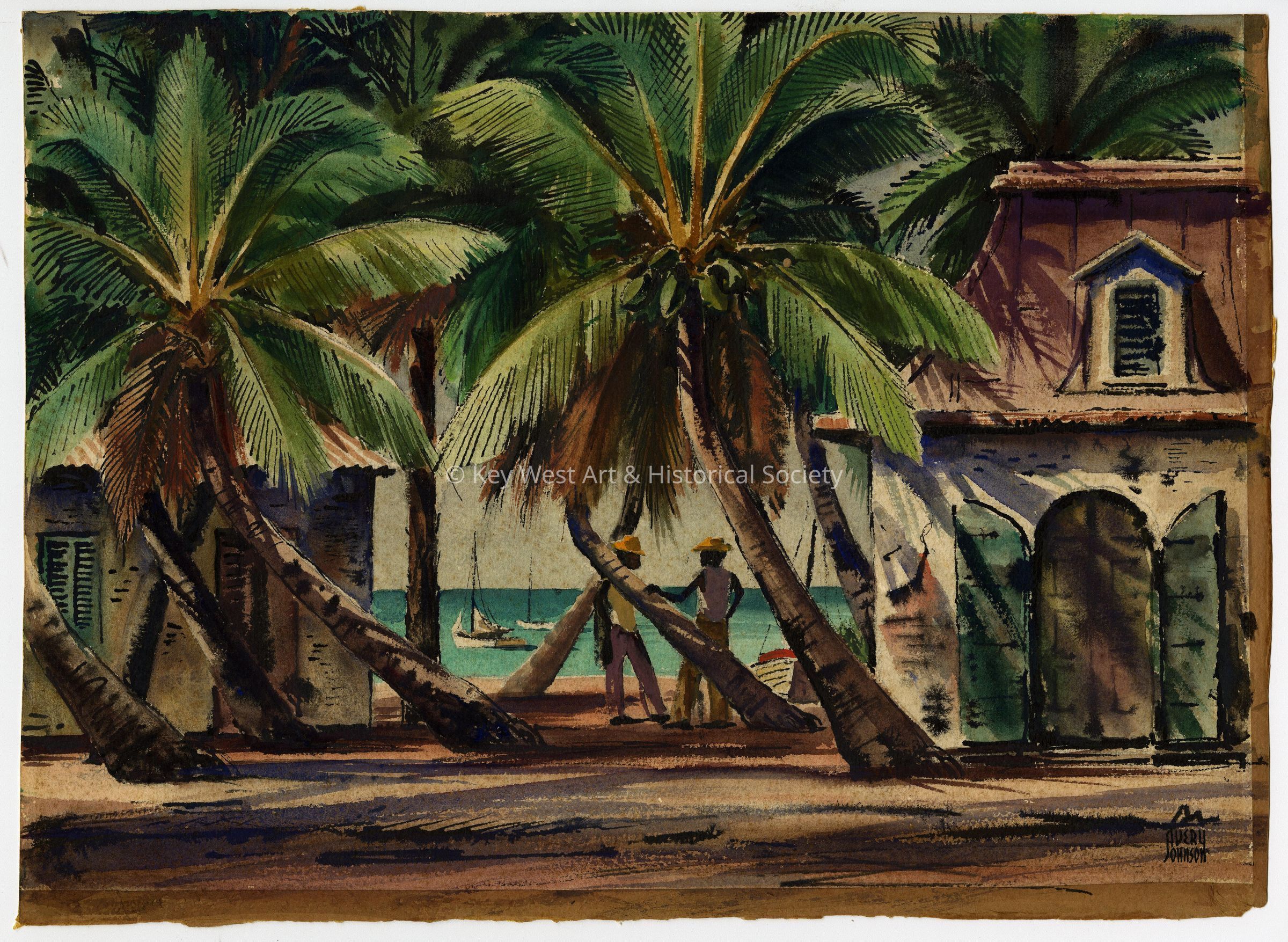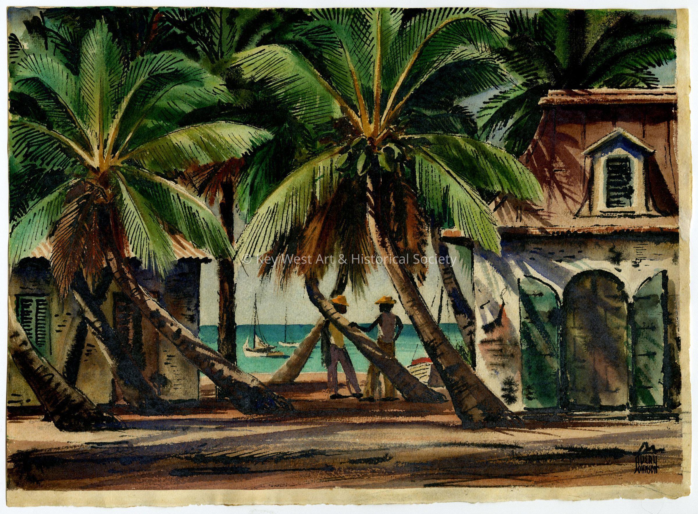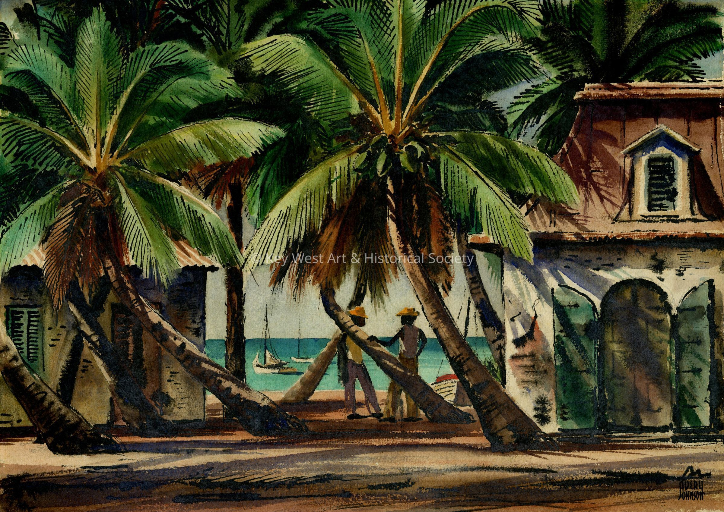 Watercolor by Avery Johnson depicting two Black men standing among palm trees and alongside an old warehouse on Key West's waterfront. Watercolor produced as part of the WPA project in Key West during the Great Depression.Artwork Details