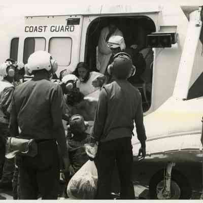 Black and white photograph of a victim of the "Old Yumi" refugee boat accident as she is transferred from a U.S. Coast Guard helicopter to safety aboard the USS Saipan. The Old Yumi capsized with 52 people on board after leaving Mariel harbor.