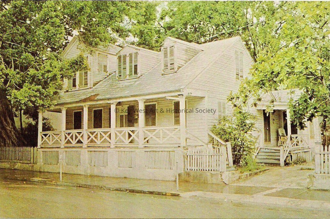 Postcard depicting a house with dormer windows and a porch. The description on the verso reads, ‘Oldest House in Key West. Now located Duval Street. Originally built by Captain Watlington on Whitehead Street. Note dormer windows and height off the ground to protect against hurricanes. There is a Dutch Oven in the rear.’Subject Place