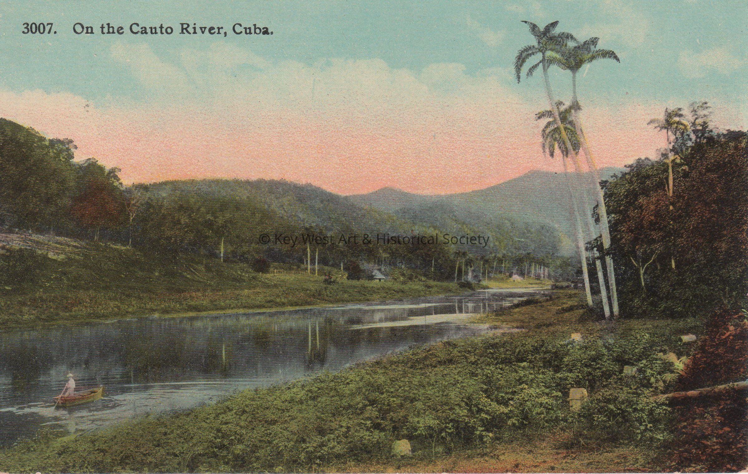 Postcard of a man in a boat on a river. The caption reads, ‘On the Cauto River, Cuba.’Subject Place