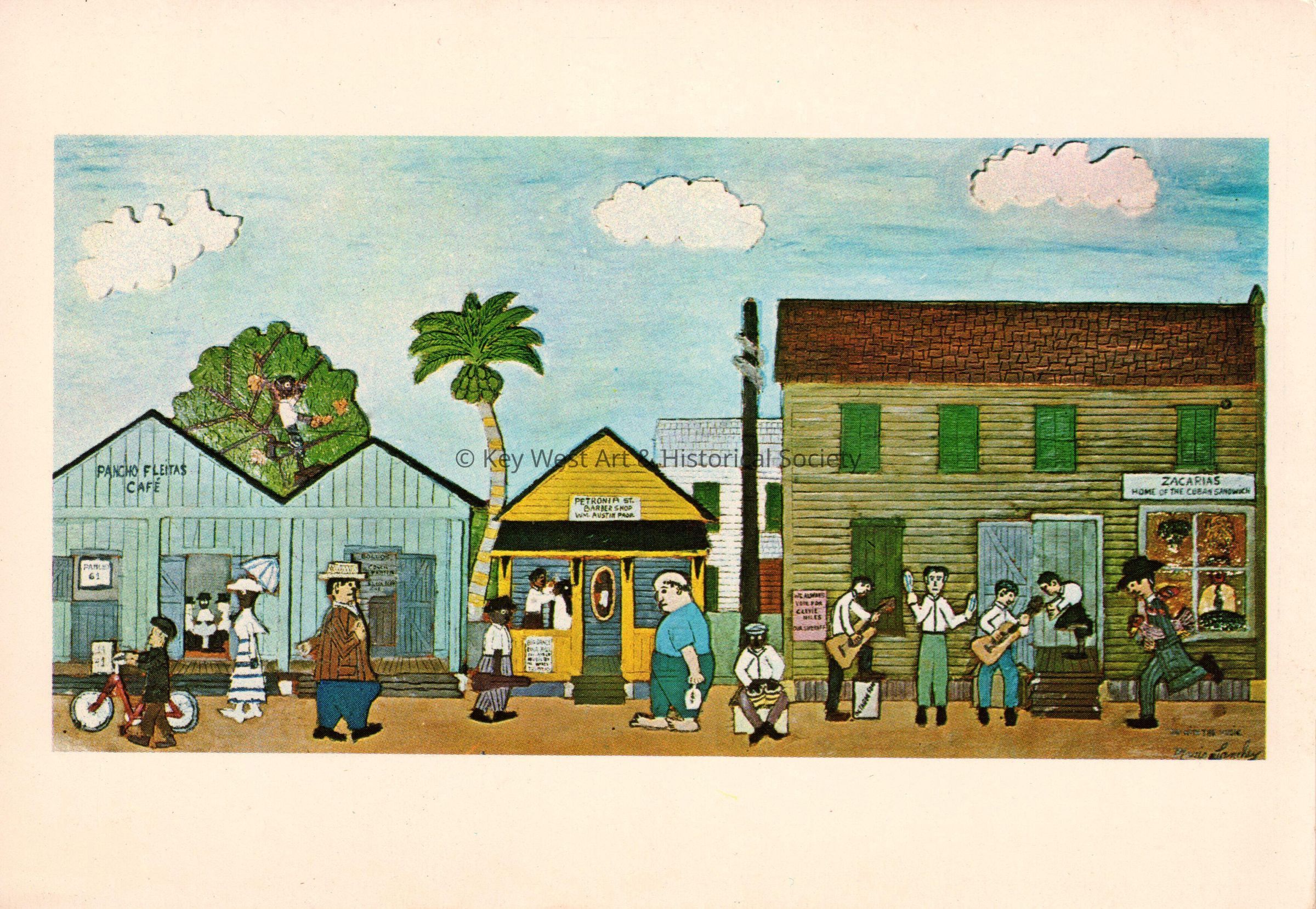 Postcard depicting a Mario Sanchez woodcarving of people and businesses on a street. Signs on the buildings read, ‘Pancho Fleitas Cafe; Petronia Street Barber Shop, William Austin, Padr.; Zacarias, home of the Cuban sandwich’. The description on the verso reads, 'Mario Sanchez. "On with the Music" - 1964 - Painted Woodcarving. This gay scene depicts the jovial and frolicsome character of the Key Westers. One sees Zacaria's Sandwich Shop and Kiosko of an earlier day (corner Duval and Petronia Streets). This scene was on the Petronia Street side. Sons of the owner of the shop, with their affable and gleeful characters, had a gift of their own to draw people. Zacaria's was like the Cuban coffee shops... a place of reunion to discuss baseball, music, and everything of enjoyment. If an ambulant musical trio or quartet passed by, Zacaria's sons, or anyone visiting there, would invite the musicians to play their instruments. It the players played "good", everyone enjoyed it, and if they played "bad", enjoyed it more, as this gave grounds to make comments and jokes. Members of the gay Cuban colony in Key West spent many happy moments here with the beloved Zacaria and his family. Collection Charlotte Tonis and Florence Weil, New Hope, Pennsylvania.'Subject Place