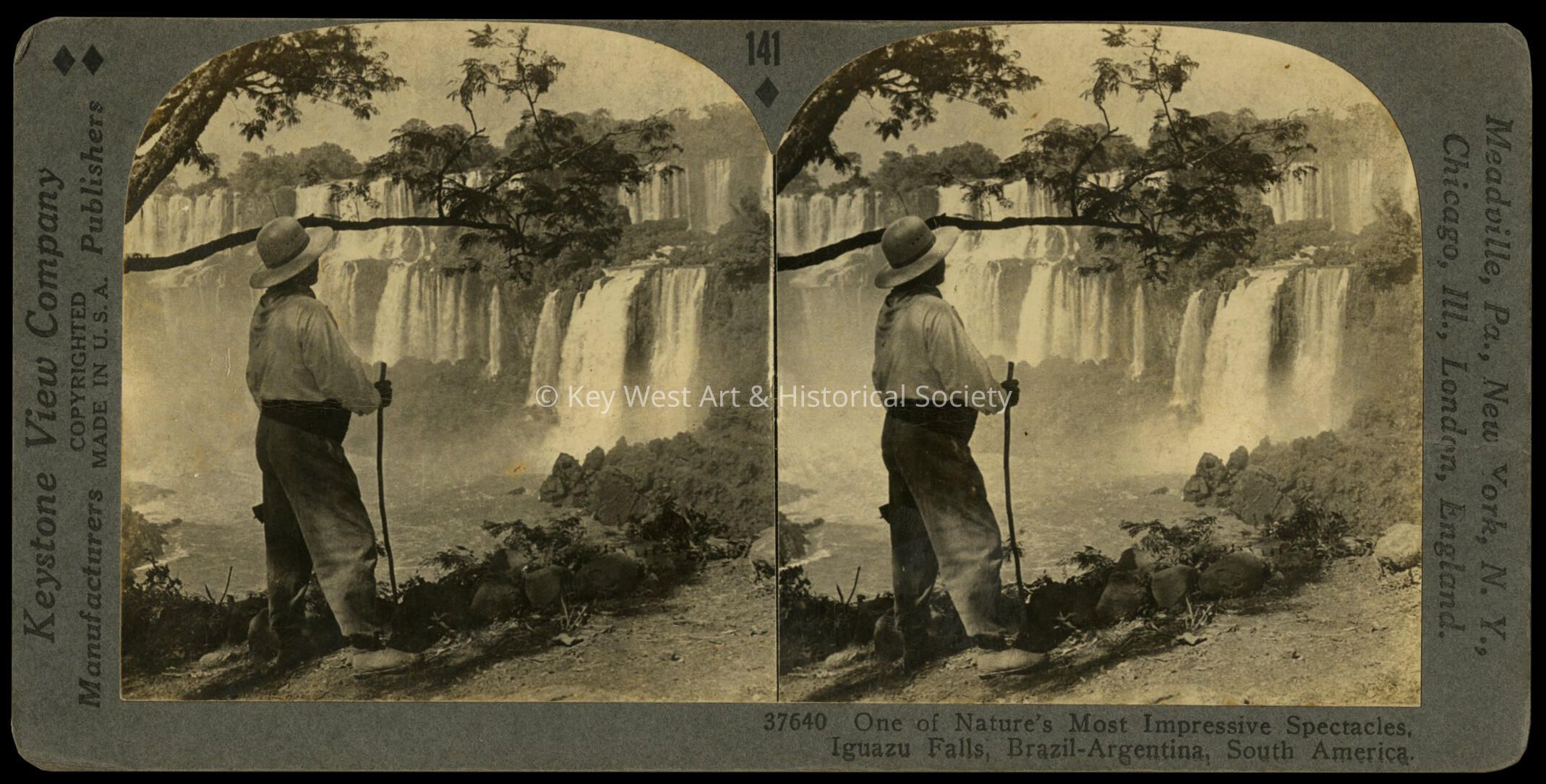Black and white stereoview of one of nature's most impressive spectacles, Iguazu Falls, Brazil-Argentina, South America. Extensive description printed on verso.Collection