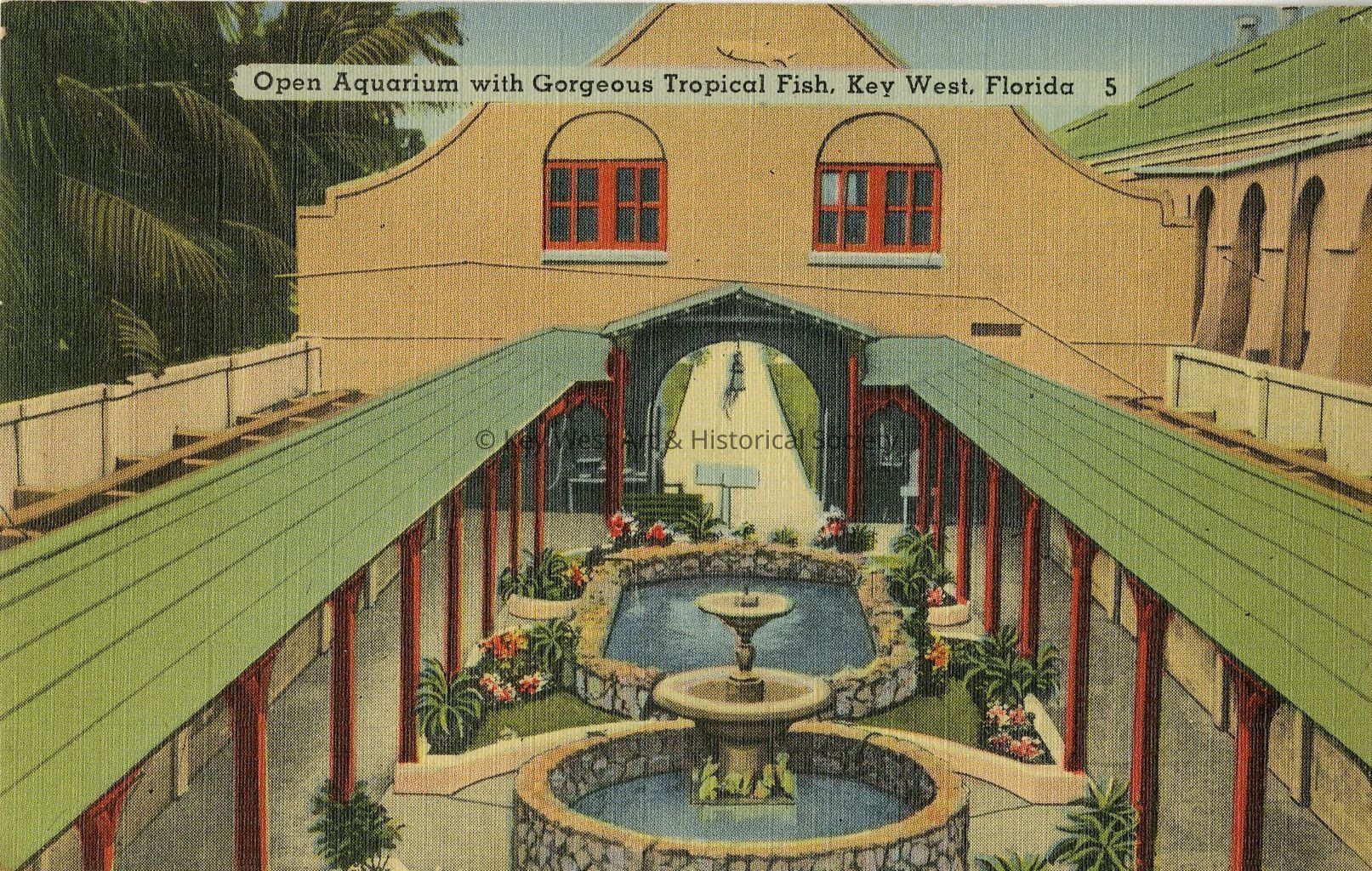 Postcard depicting the open aquarium with gorgeous tropical fish in Key West, Florida. Notation on verso, 'Here is the Nation's first open air aquarium. Commercial fisherman are constantly bringing in rare specimens of marine life.'Collection