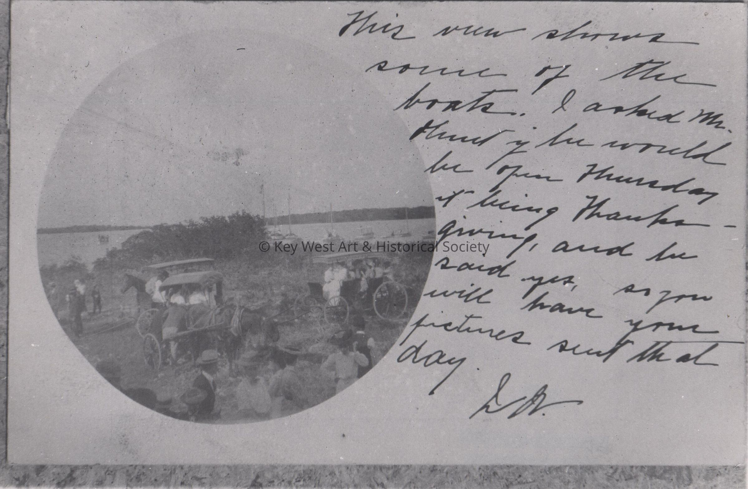 Black and white photograph of a parade of horse-drawn carriages and boats at the opening of County Road, present-day Flagler Avenue. Handwritten caption on the image reads, 'This view shows some of the boats. I asked Mr. Grant if he would be open Thursday, it being Thanksgiving, and he said yes. So you will have your pictures sent that day. L.V.'Photograph Details