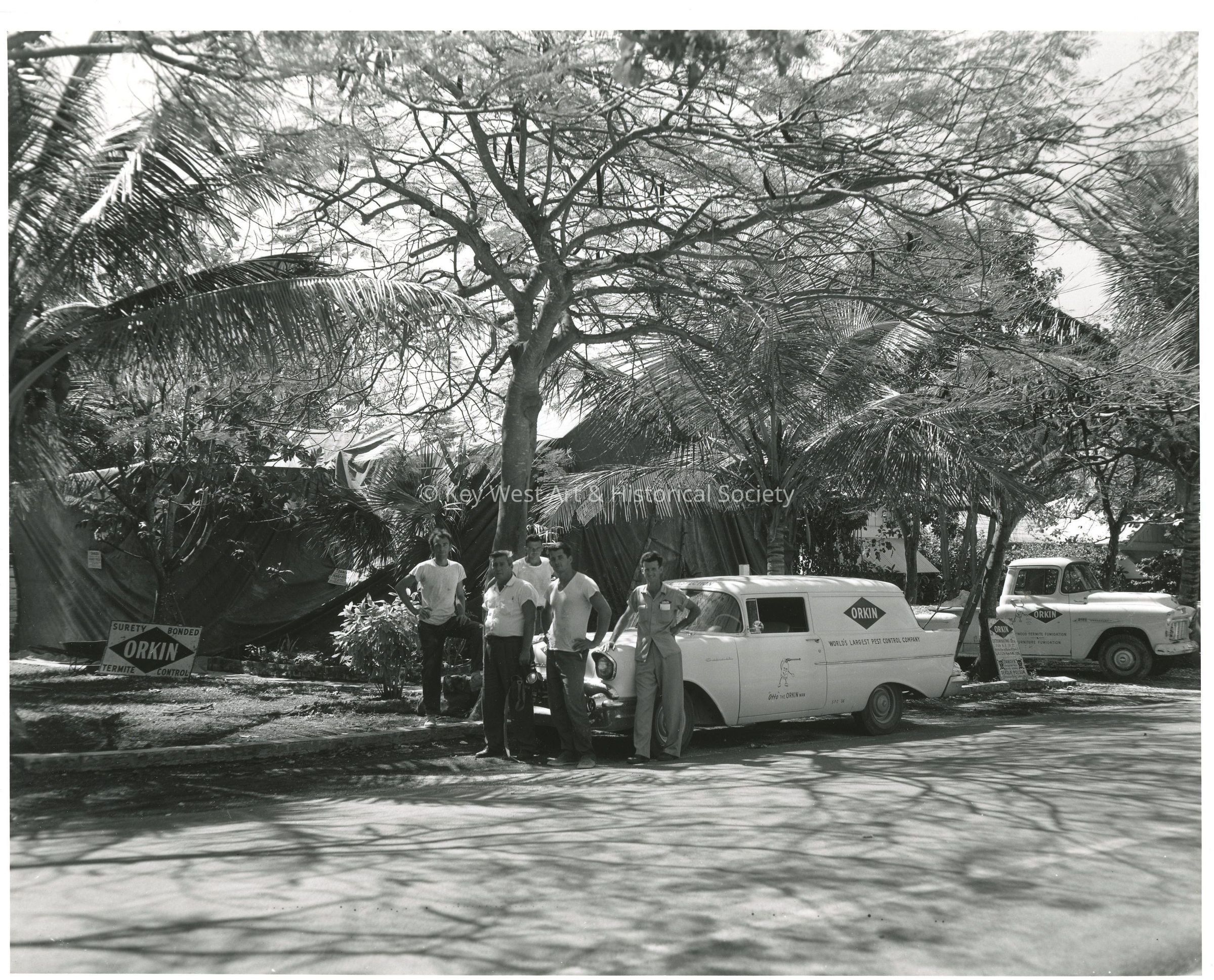Black and white photograph of the employees of Orkin Exterminator company standing in front of tented home.