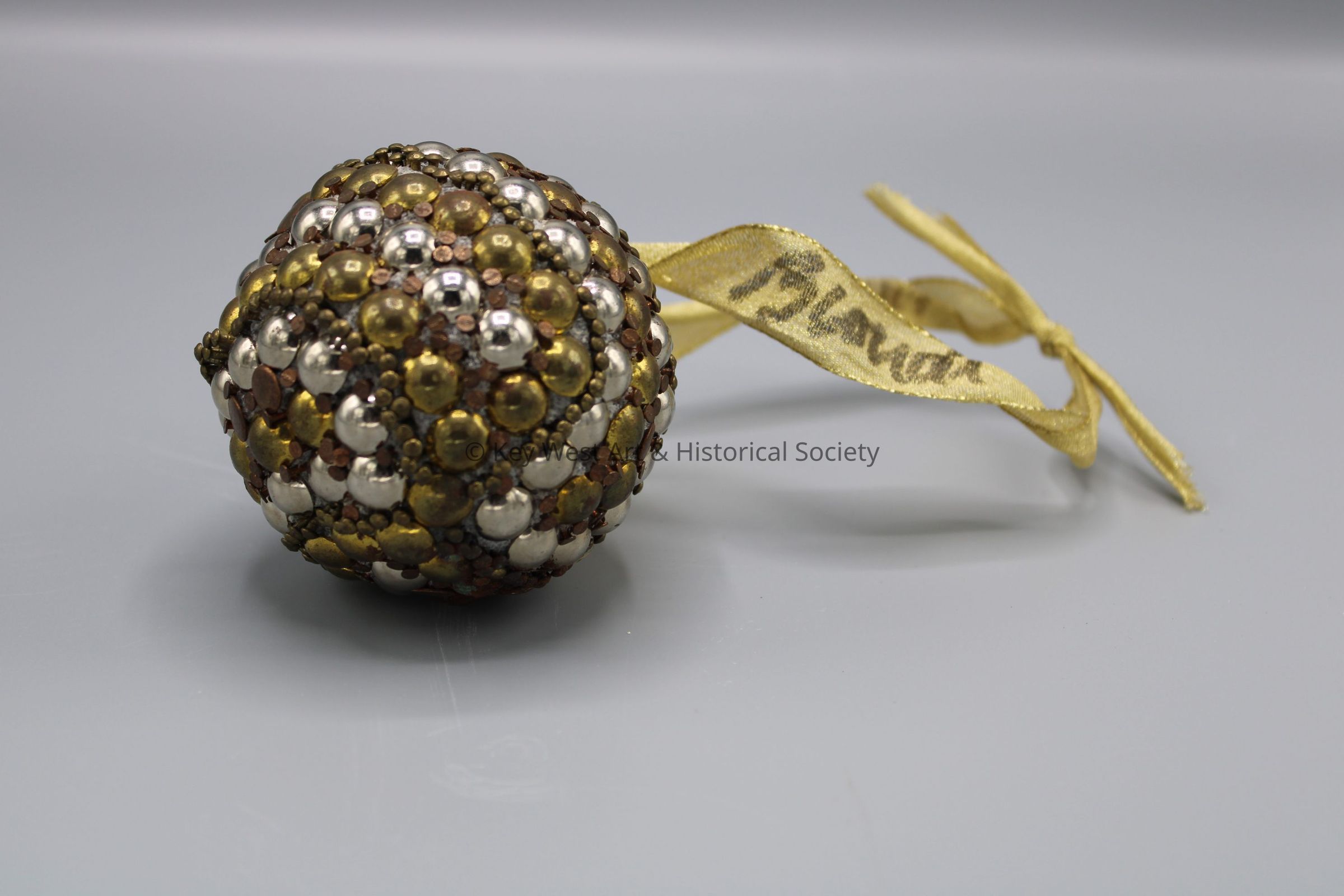 A Styrofoam ball decorated with copper, brass, and silver colored hardware attached to a knotted yellow ribbon. The tree ornament is attributed to artist Craig Biondi.