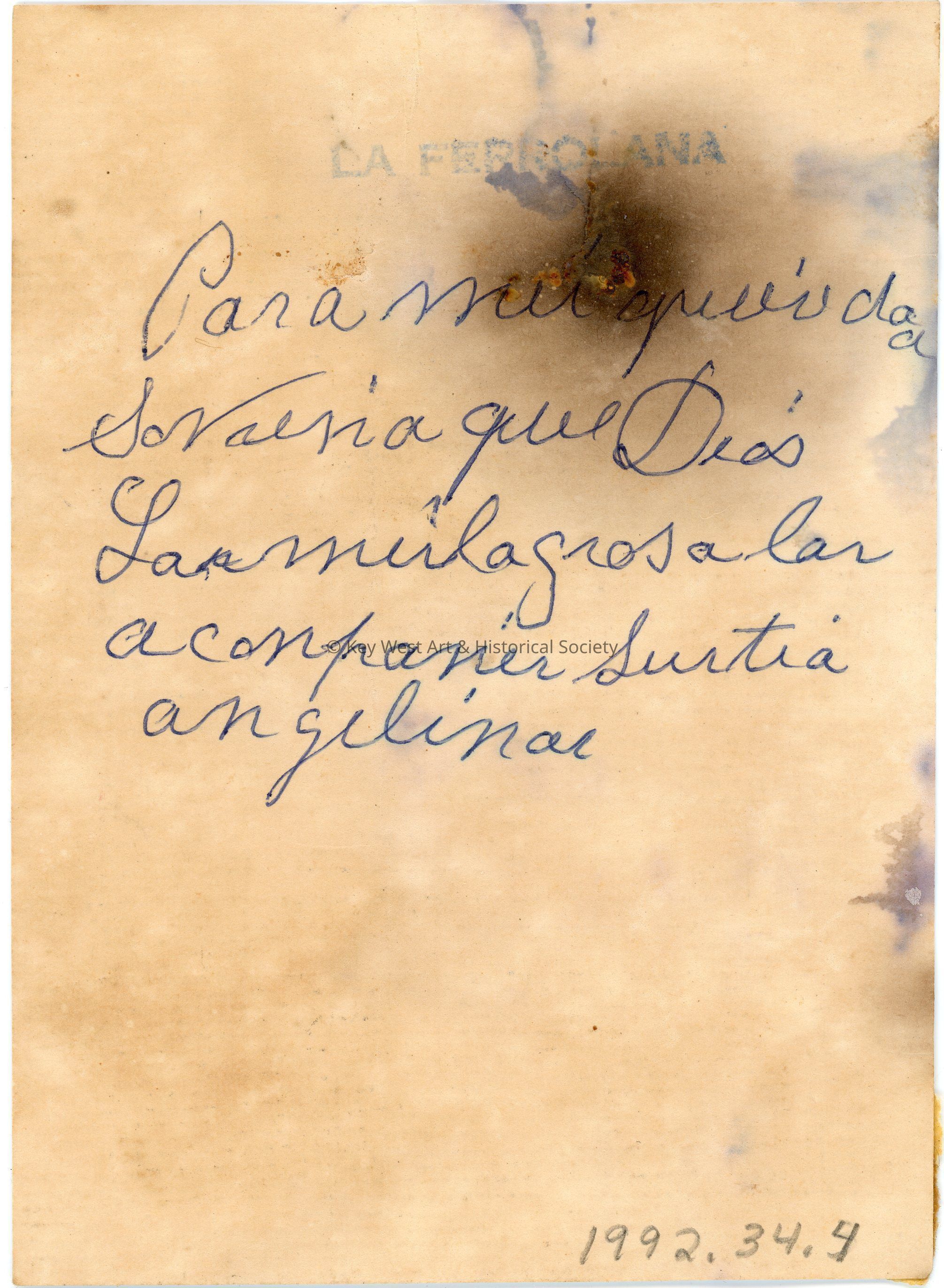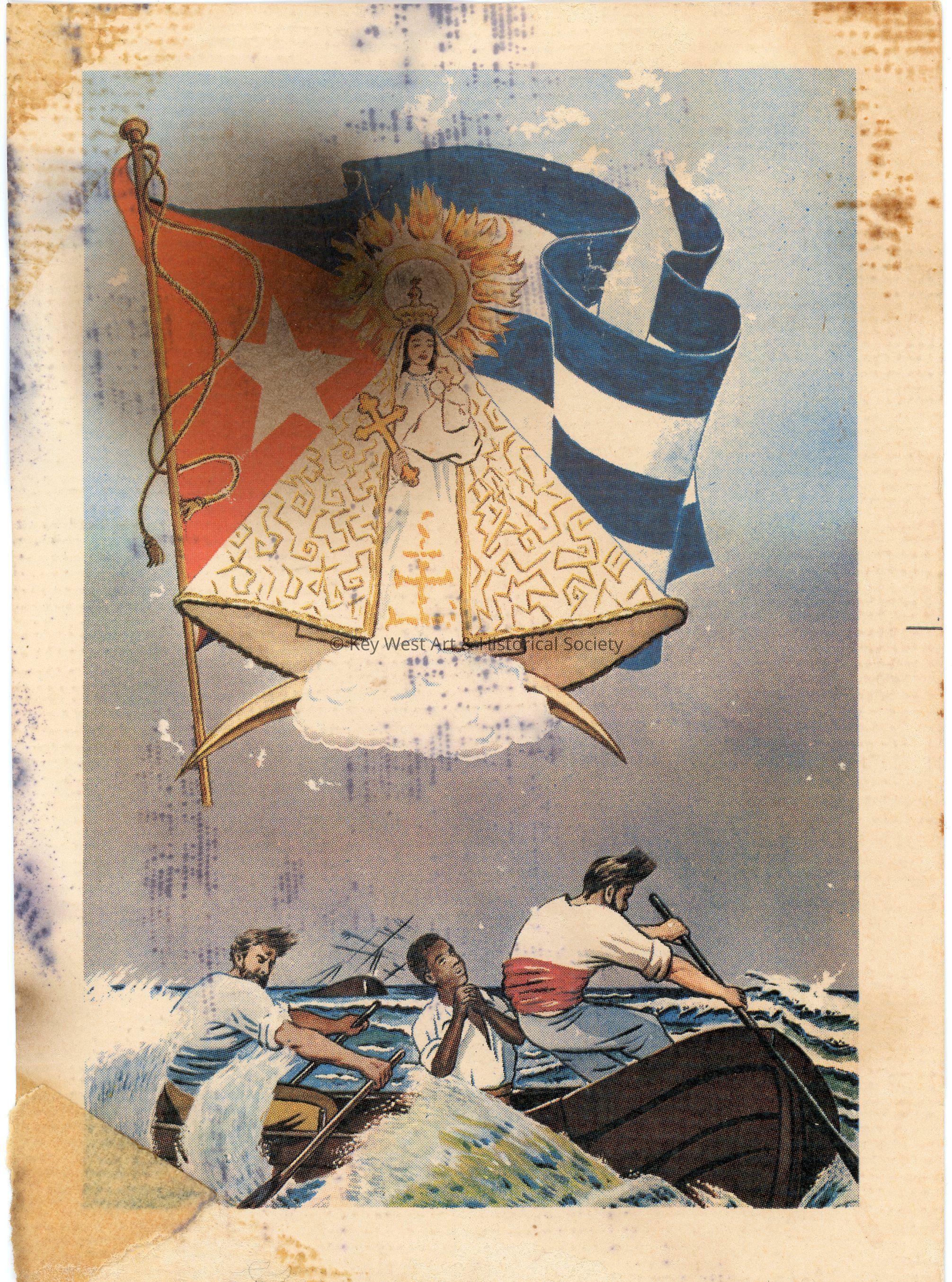 A thick paper card with a printed illustration of three men rowing a boat in turbulent waters with a large Cuban flag and the Virgin Mary above. The Virgin Mary is the patron saint of Cuba and is also known as Our Lady of Charity. The back of the card has a handwritten note in Spanish and a stamp that reads 'La Ferrolana.' The card was found inside a beaded clutch (1992.34.0001)