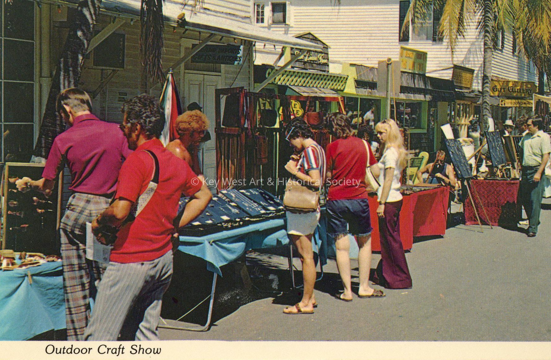 Postcard depicting an open air artisan market along Greene Street. Notation on verso, 'Sidewalk art displays Whitehead and Greene streets.'Subject Place