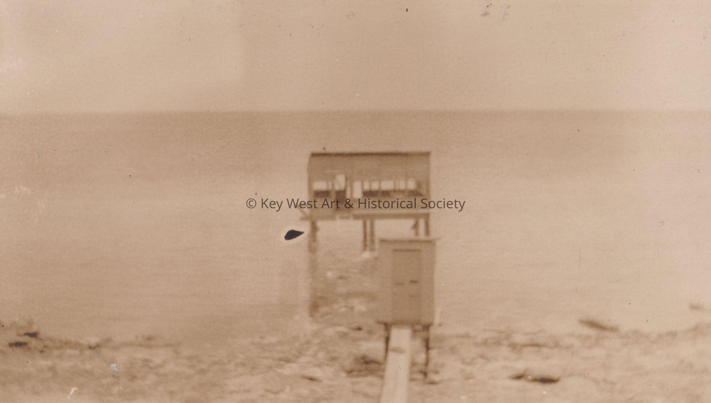 Black and white photograph of the outhouses at Fort East Martello. Possibly a disused boathouse in the background and a privy in the foreground. Plank led from doorway through casement #4 of Martello. Photograph by William Whitlock, U.S. Navy radioman stationed at Fort East Martello.