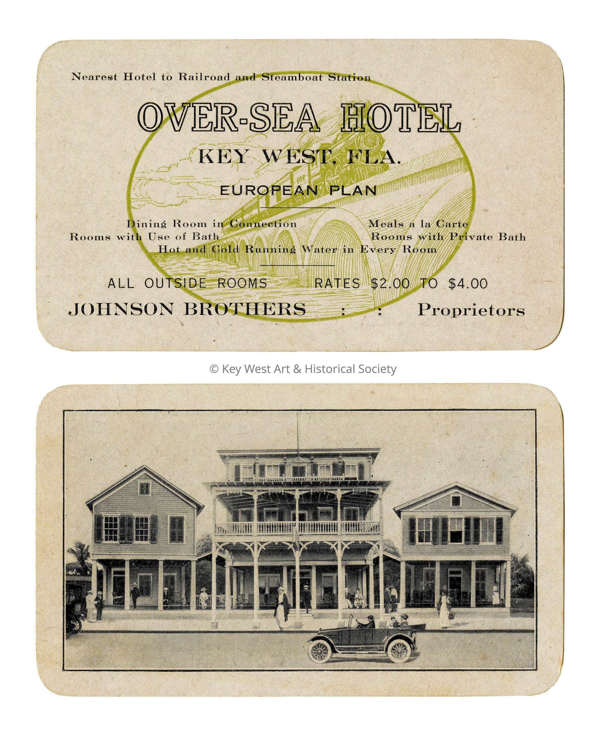 Over-Sea Hotel advertising card promoting the hotel that formerly stood at 919 Fleming Street. Text reads, 'Nearest Hotel to Railroad and Steamboat Station. Dining Room in Connection. Meals a la Carte. Rooms with Use of Bath. Rooms with Private Bath. Hot and Cold Running Water in Every Room. All Outside Rooms. Rates $2.00 to $4.00. Johnson Brothers: Proprietors' An image of the hotel on verso.Collection