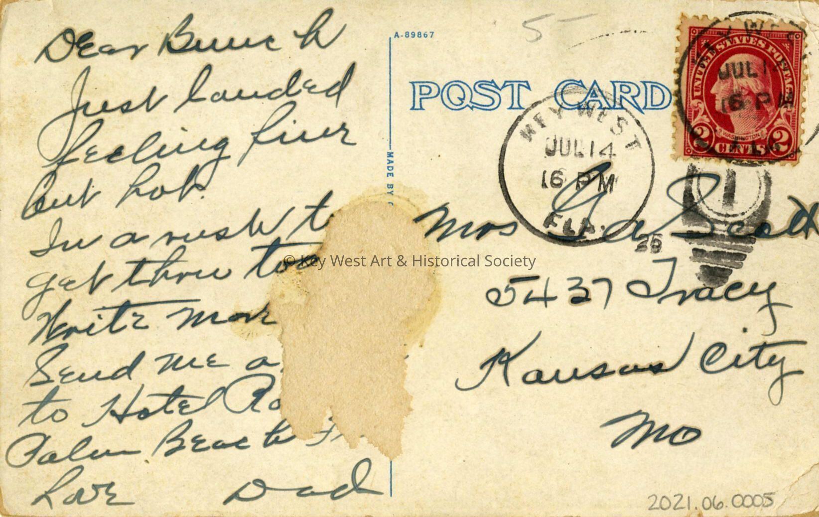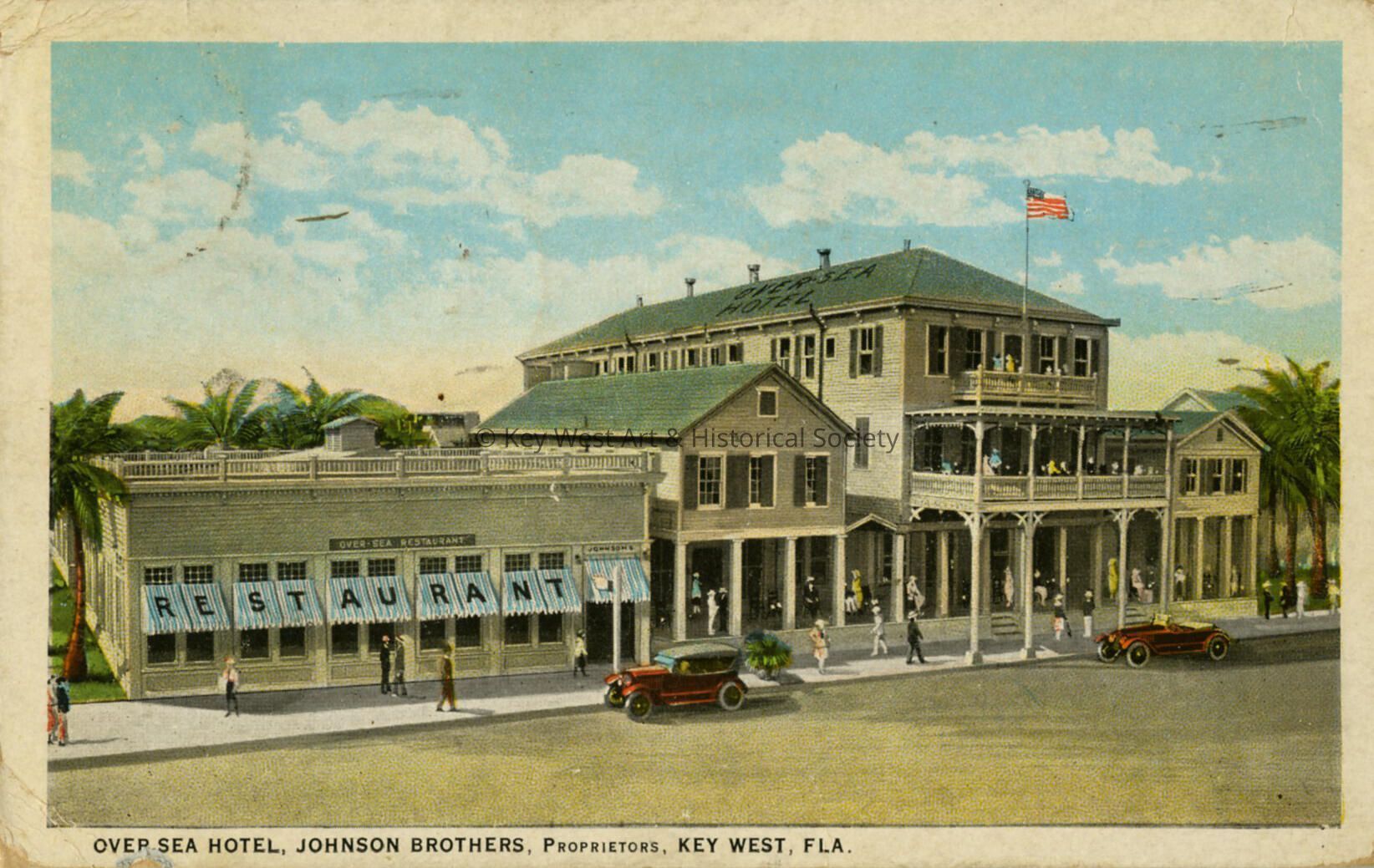 Postcard depicting the Over Sea Hotel on Fleming Street. The caption reads, ‘Over-sea Hotel, Johnson Brothers, Proprietors, Key West, Fla.’Subject Place
