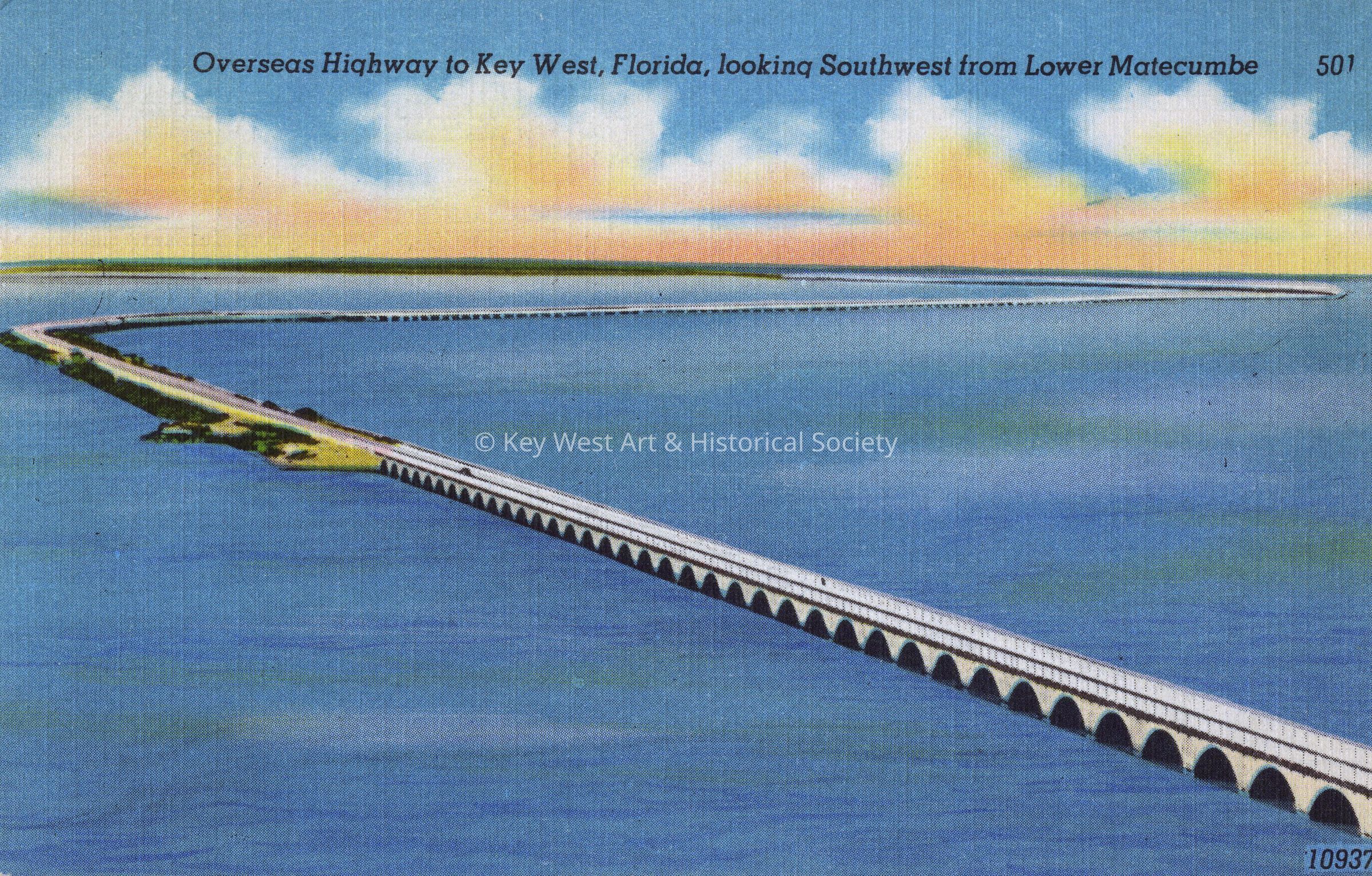 Postcard depicting the Channel No. 2 and Channel No. 5 bridges on the Overseas Highway. The caption reads, ‘Oversea Highway to Key West, Fla., looking Southwest from Lower Matecumbe.’Subject Place