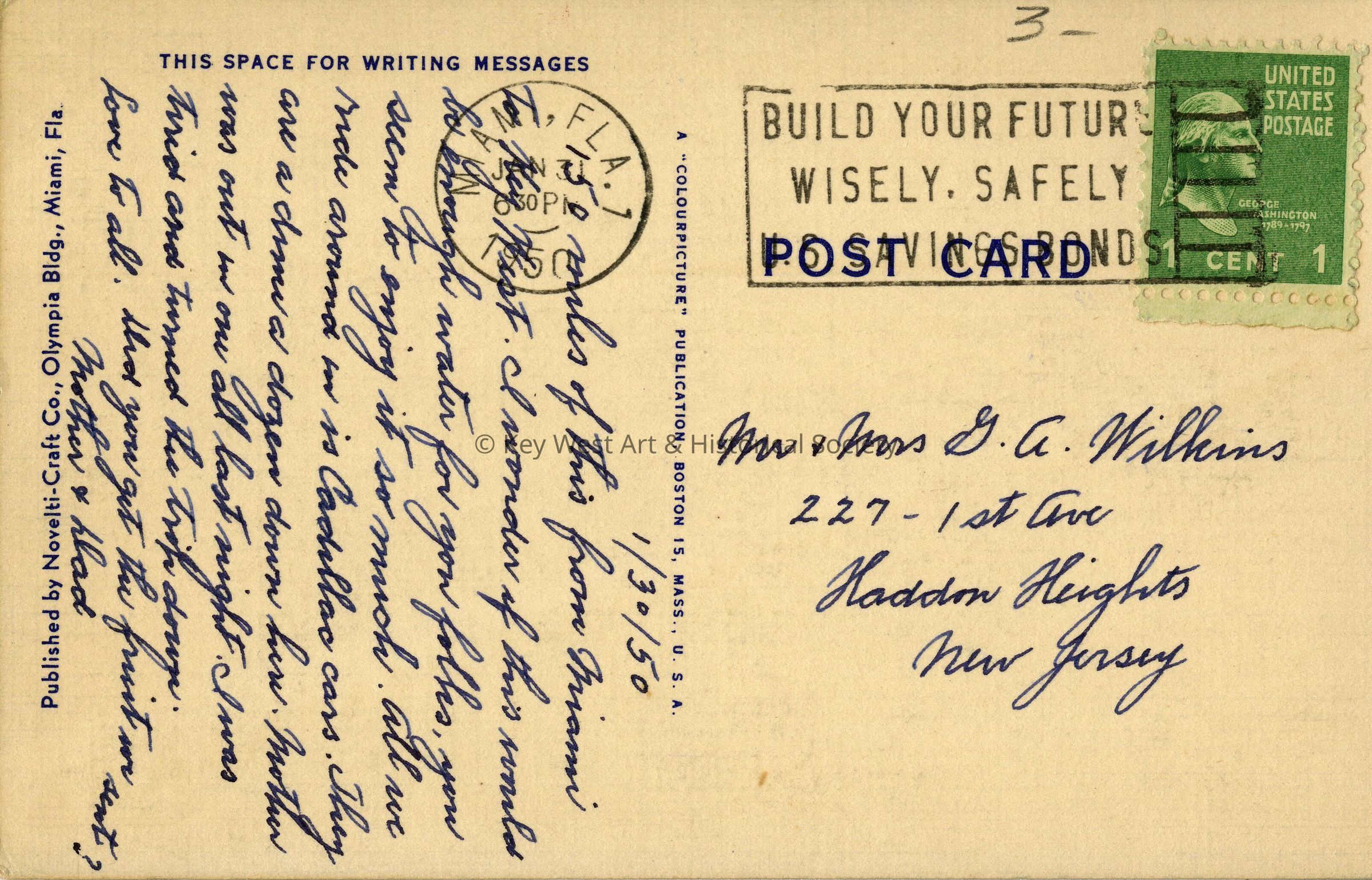 150 miles of this from Miami to Key West. I wonder if this would be enough water for you folks, you seem to enjoy it so much. All we ride around in is Cadillac cars. They are a dime a dozen down here. Mother was out in one all last night. I was tired and turned the trip down. Love to all. Did you get the fruit we sent? Mother & Dad.Language