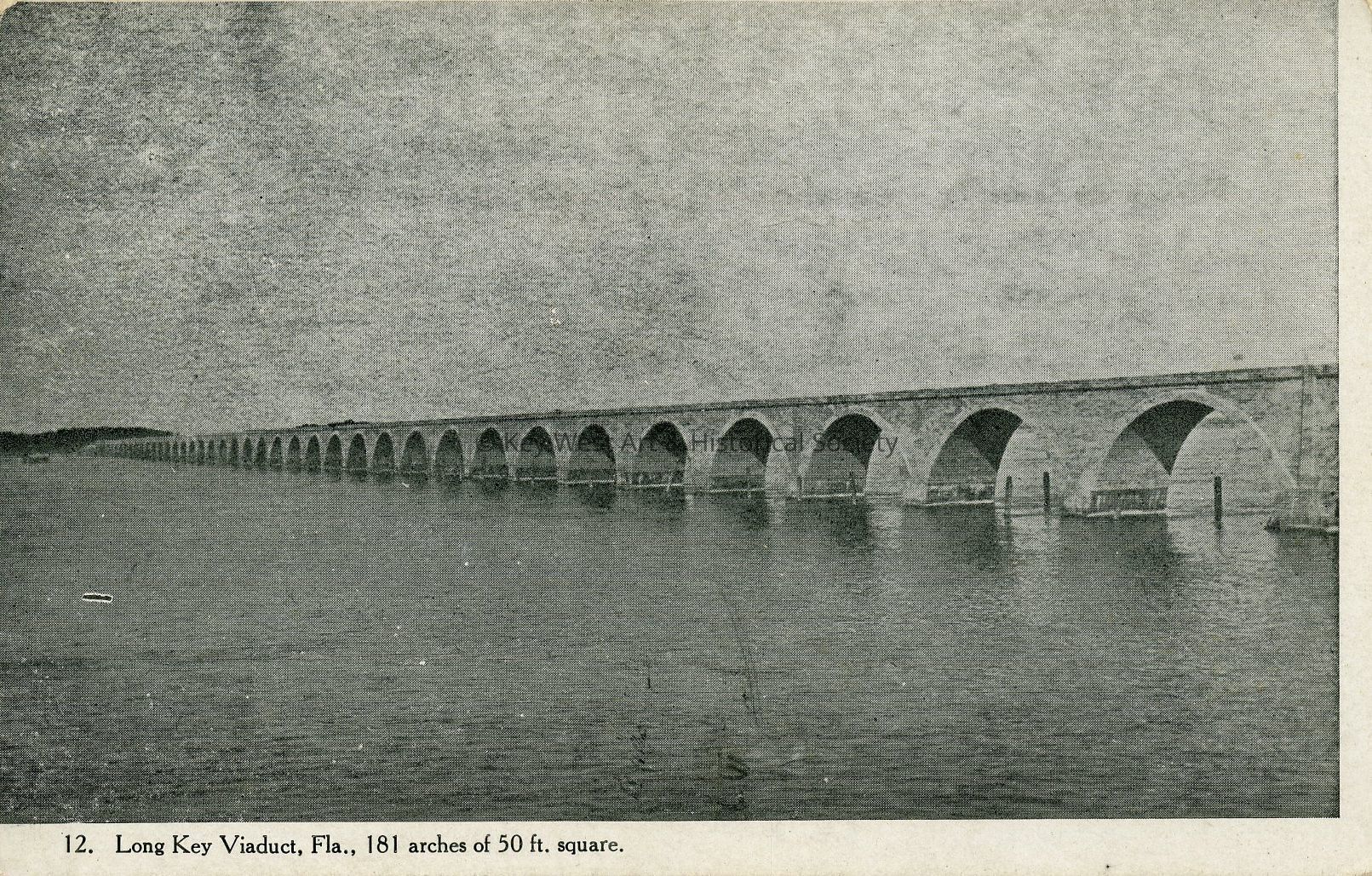 Postcard depicting the construction of the Florida East Coast Railway's Oversea Extension, specifically the Long Key viaduct consisting of 181 arches. Number 12 of the F.E.C. Extension Series.Subject Person/Organization