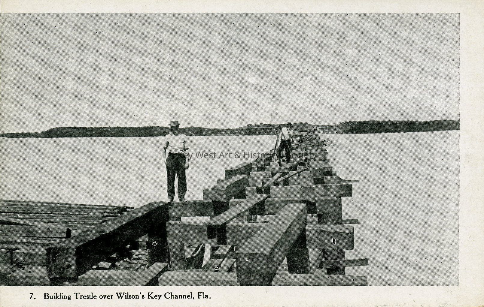Postcard depicting the construction of the Florida East Coast Railway's Oversea Extension, specifically workers building a trestle over Wilson's Key Channel. Number 7 of the F.E.C. Extension Series.Subject Person/Organization