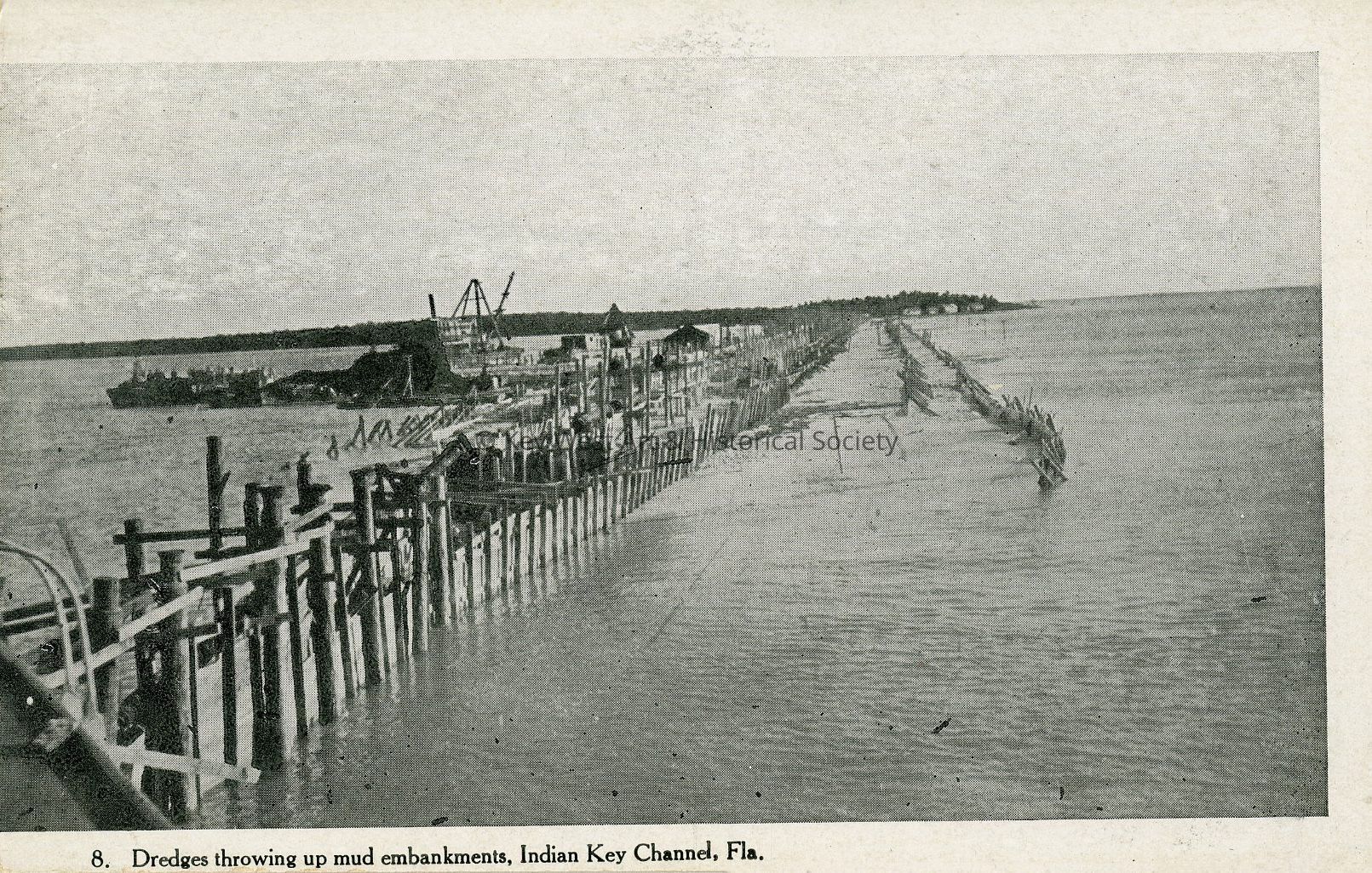 Postcard depicting the construction of the Florida East Coast Railway's Oversea Extension, specifically dredgers creating mud embankments at Indian Key. Number 8 of the F.E.C. Extension Series.Subject Person/Organization