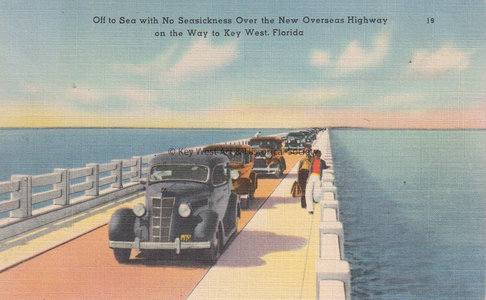Postcard depicting cars and a couple crossing a long bridge. The caption reads, ‘Off to Sea with no seasickness over the new Overseas Highway on the way to Key West, Florida.’ The description on the verso reads, 'Stretching its silver-length across the blue waters of the Atlantic and the Gulf of Mexico, the new Overseas Highway connects Key West with the mainland. It is regarded as one of the engineering marvels of modern times.'Collection
