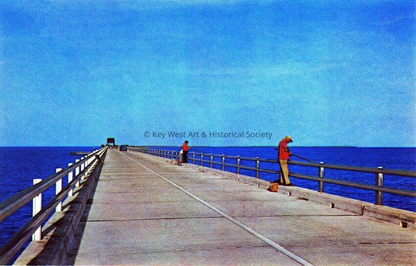 Postcard depicting men fishing from a bridge. The description on the verso reads, 'Fishing is a popular pastime for tourists who travel the Overseas Highway to Key West, Florida.'Collection