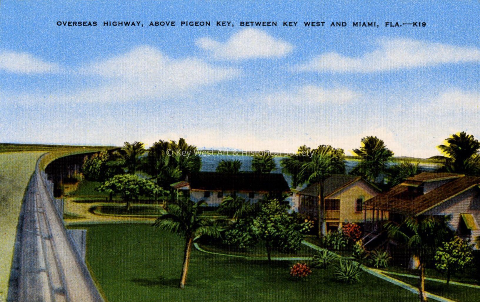 Linen postcard depicting the Overseas Highway above Pigeon Key. The caption reads, ‘Overseas Highway, above Pigeon Key, between Key West and Miami, Fla.' Notation on verso, 'Key West is connected with Miami, 170 miles, by the world famous Overseas Highway. There are scores of bridges and viaducts. One bridge is more than seven miles long. Total length: 127 miles.'Subject Place