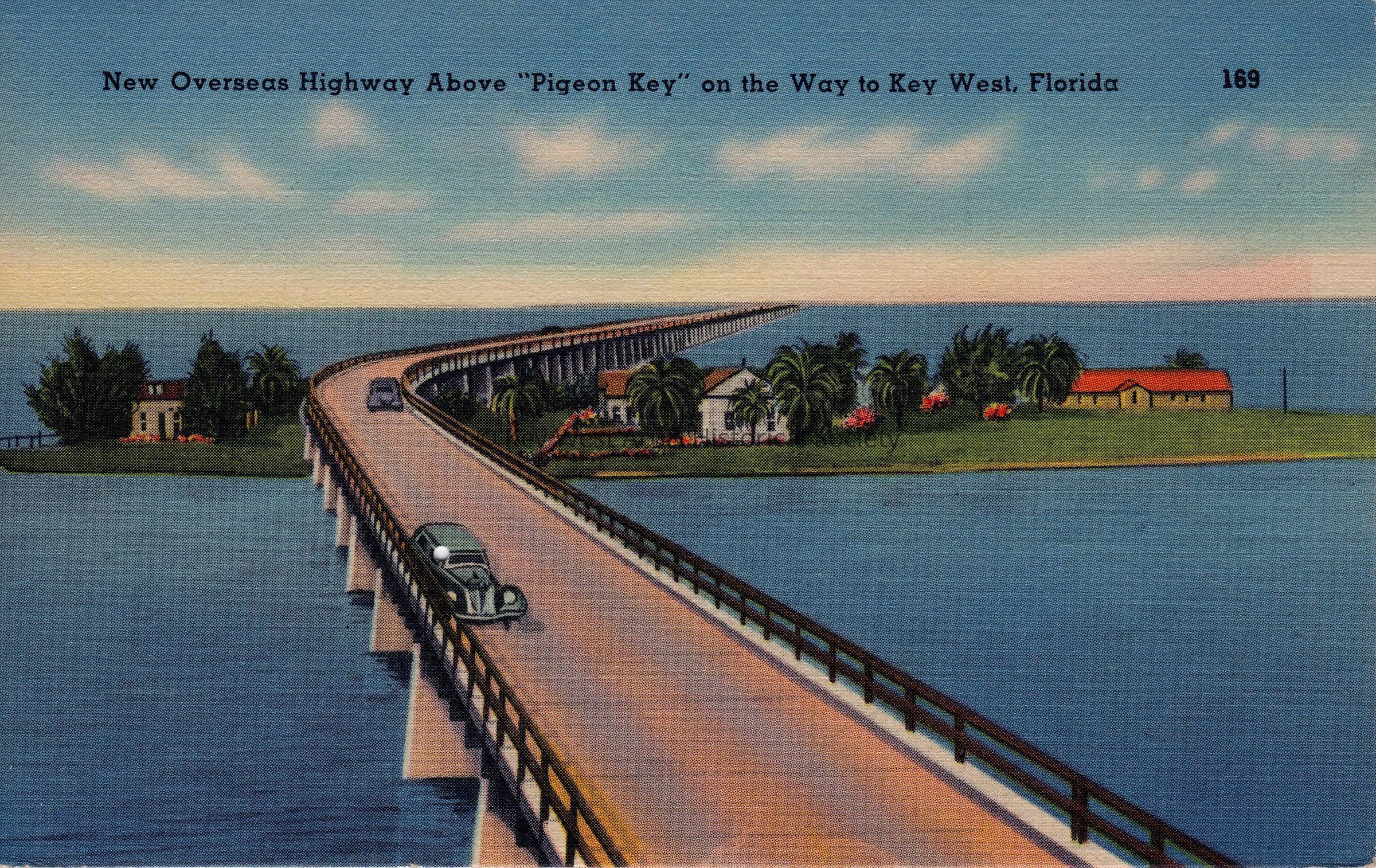 Postcard depicting cars on a highway that passes over Pigeon Key. The caption reads, ‘New Overseas Highway above “Pigeon Key” on the way to Key West, Florida’. The description on the verso reads, 'Motoring to and from Key West one passes entirely over Pigeon Key as shown in this view of the New Overseas Highway. This marvel has been constructed over the bed of the old Florida East Coast Railroad.'Collection