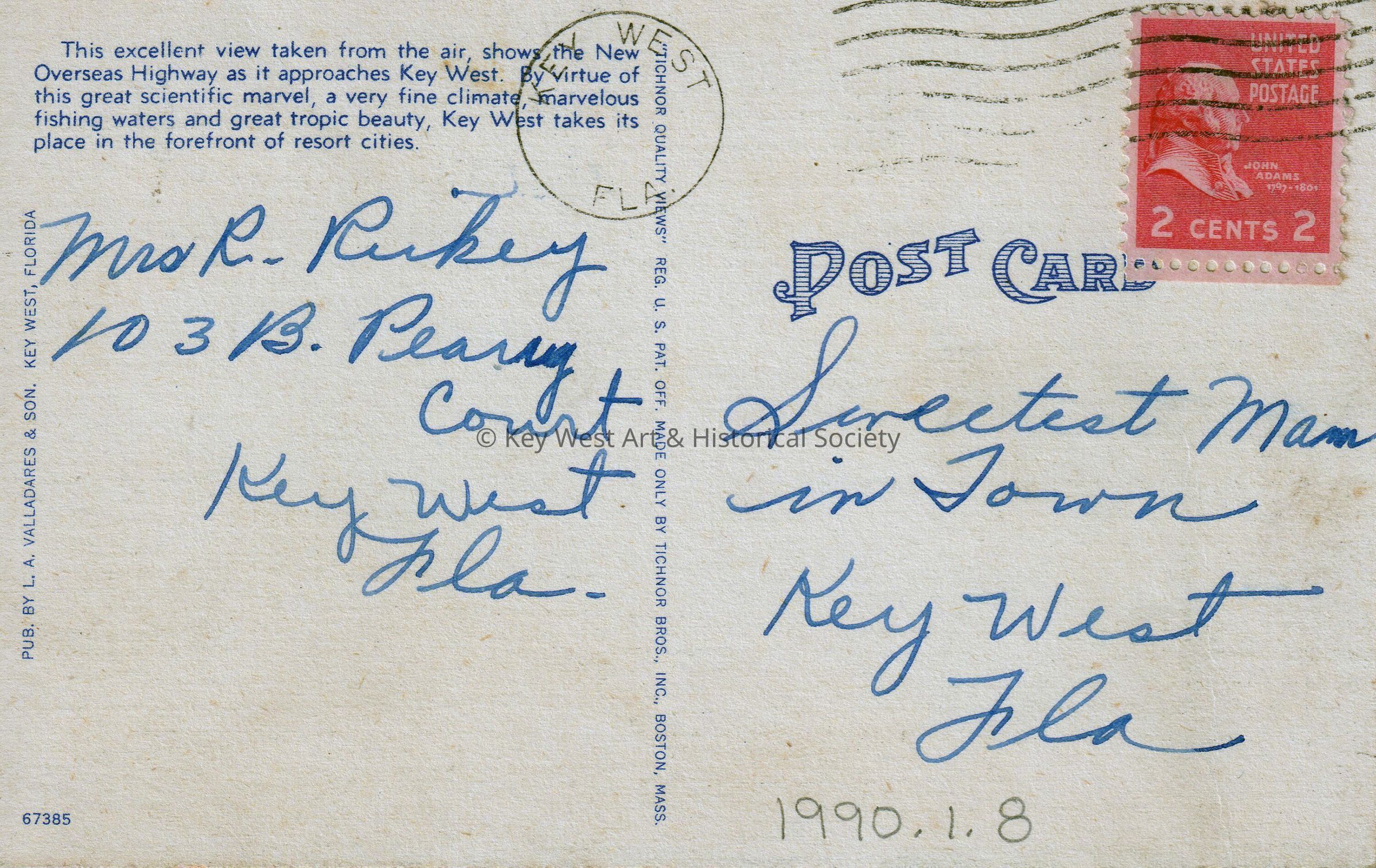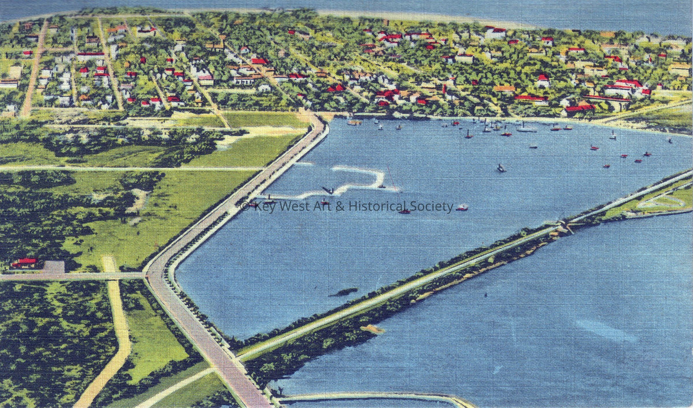 Postcard depicting an aerial view of Key West from the east. Notation on verso reads, ‘Highway Approach and Key West, Florida from the Air. This excellent view taken from the air, shows the New Overseas Highway as it approaches Key West. By virtue of this great scientific marvel, a very fine climate, marvelous fishing waters and great tropic beauty, Key West takes its place in the forefront of resort cities.’Subject Place