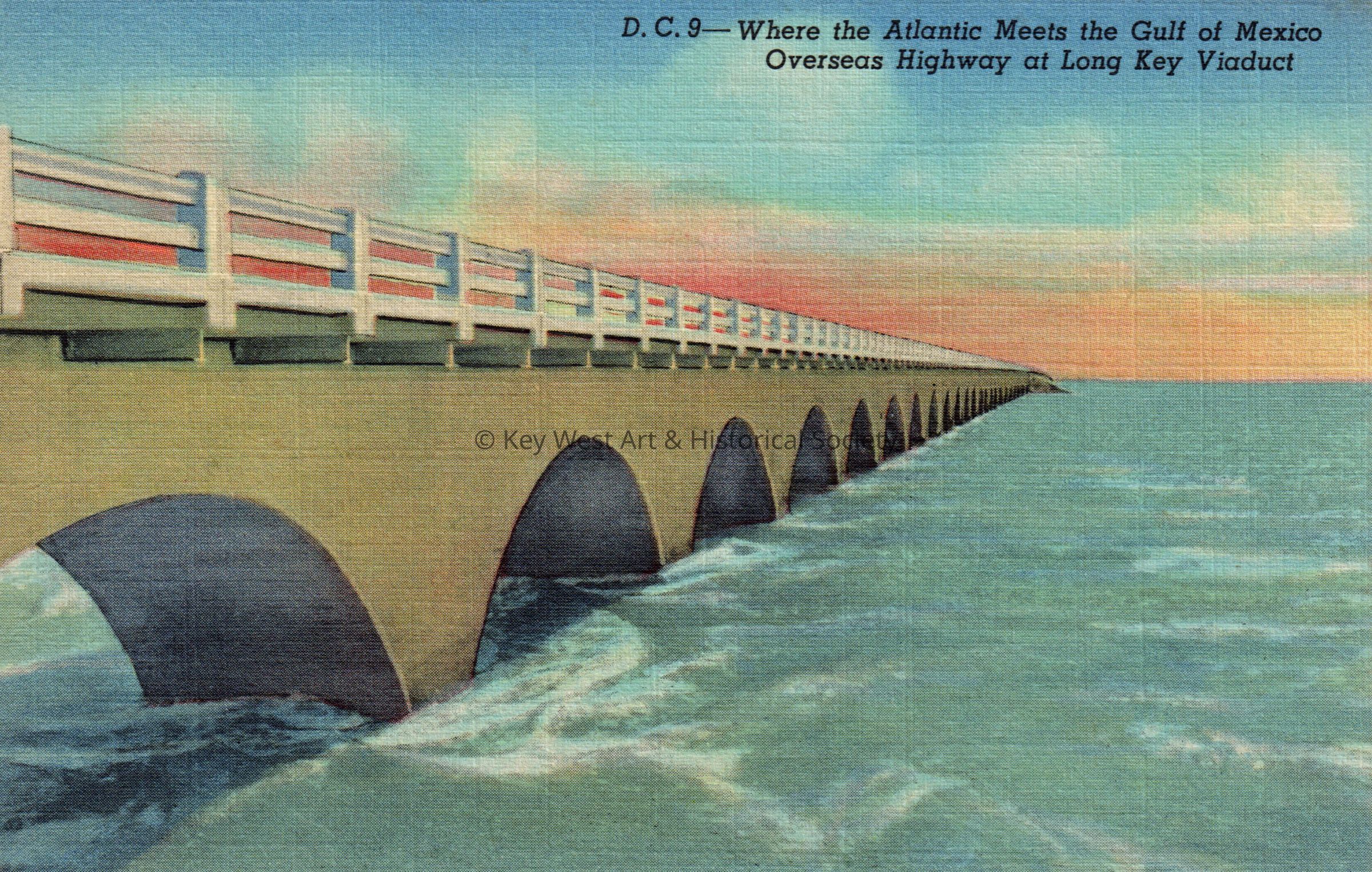 Postcard depicting a bridge over water. The caption reads, ‘Where the Atlantic meets the Gulf of Mexico, Overseas Highway at Long Key Viaduct’. The description on the verso reads, 'In 1937 the Overseas Road and Bridge Commission acquired 40 miles of abandoned railroad viaducts and roadbed. These have been converted into highway bridges and a magnificent roadway which stretches for miles over the open sea to Key West, the southernmost city in the U.S.'Subject Place