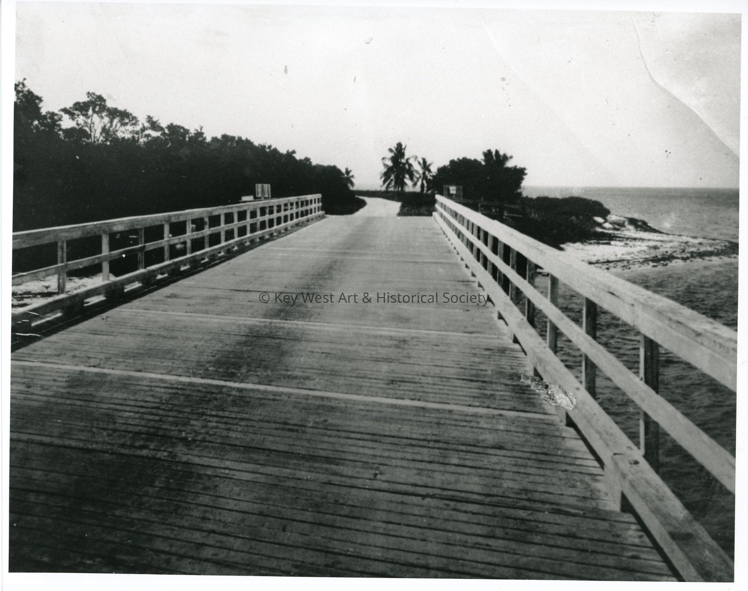 Black and white photograph of an original wooden bridge that made up the Overseas Highway.