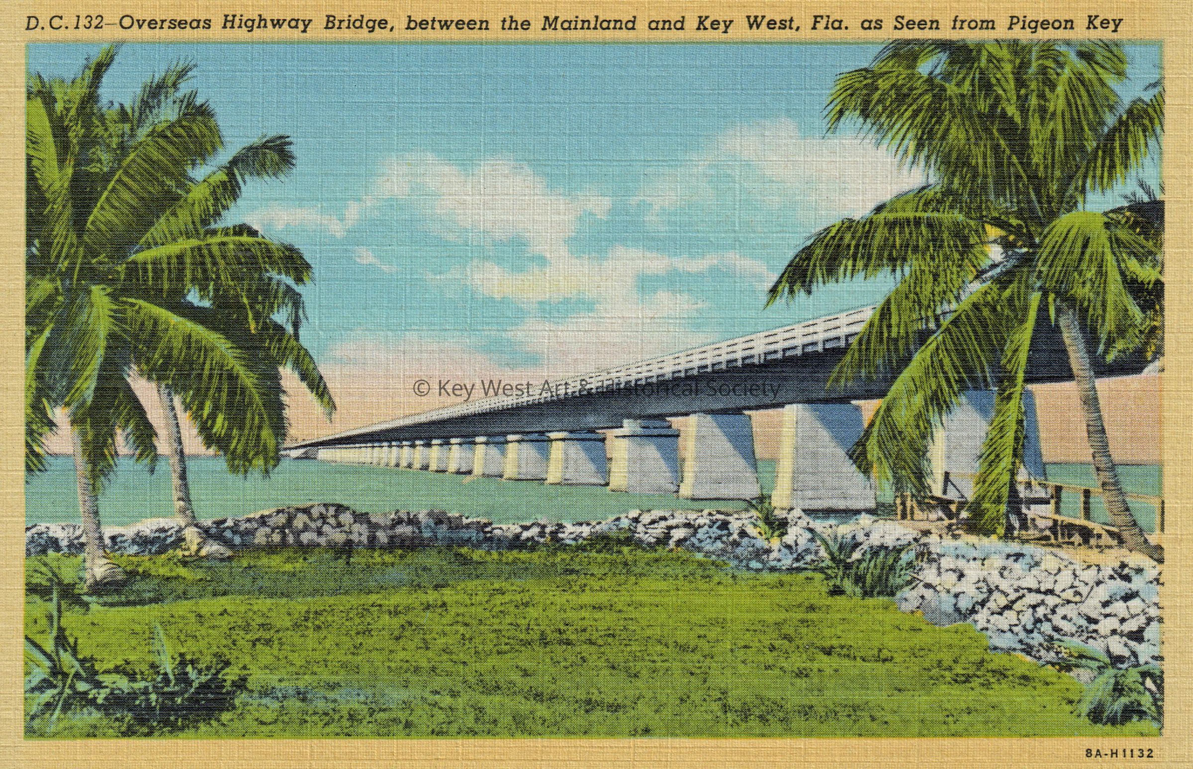 Postcard depicting the Seven Mile Bridge as it crossed Pigeon Key. The caption reads, ‘Overseas Highway Bridge, between the mainland and Key West, Florida, as seen from Pigeon Key’.Subject Place