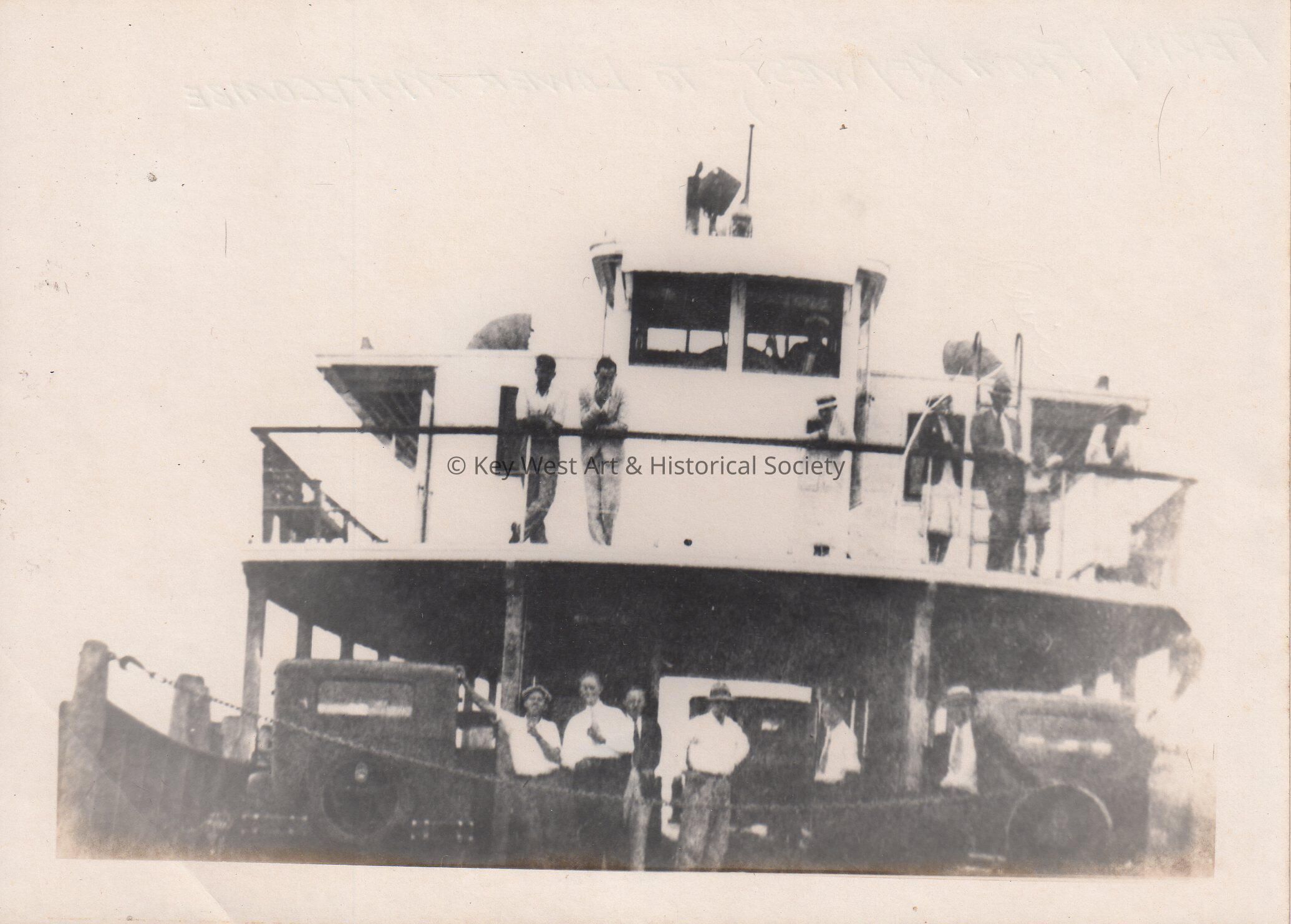 Black and white photograph of passengers and cars onboard the Overseas Highway ferry from Key West to Lower Matecumbe.