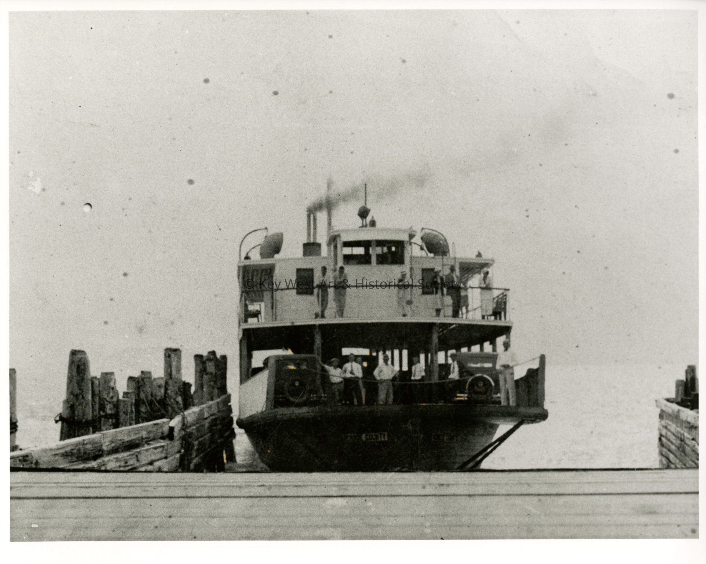 Black and white photograph of an Overseas Highway ferry at the dock, possibly at Big Pine Key.