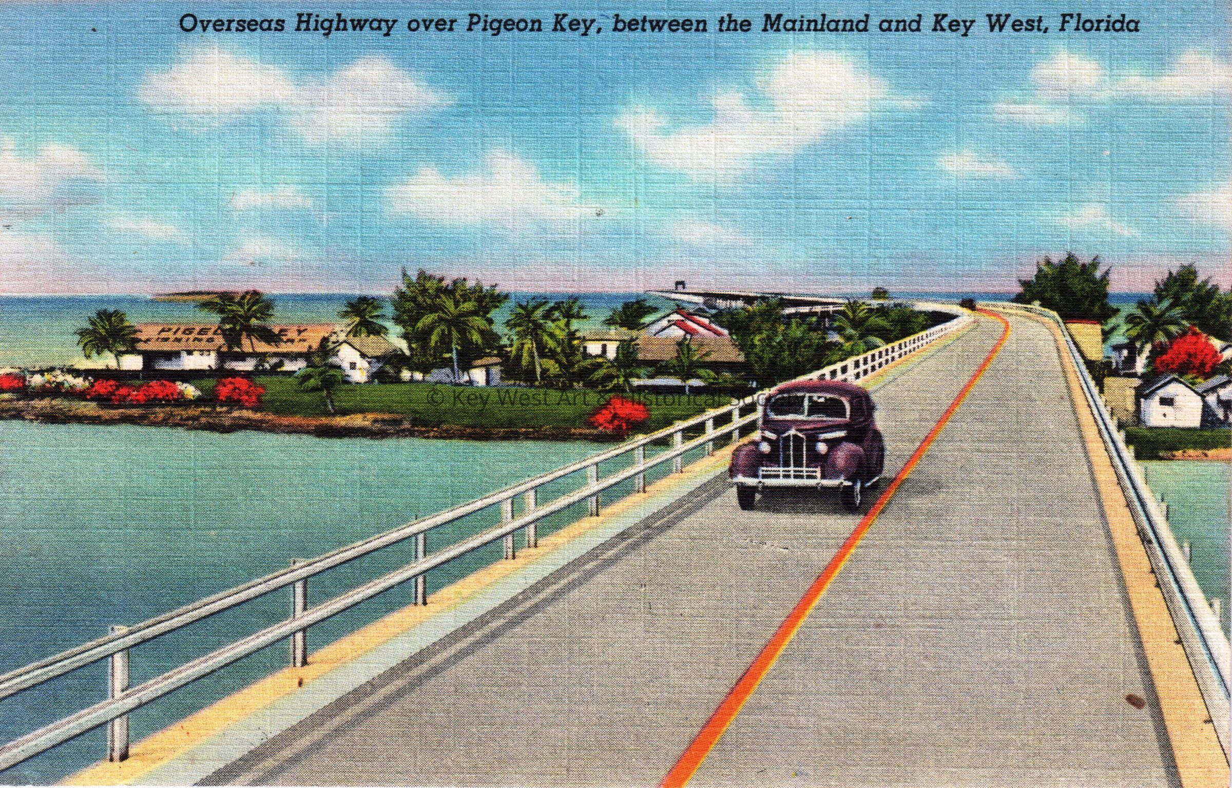 Postcard depicting a car on the Seven Mile Bridge above Pigeon Key. The caption reads, ‘Overseas Highway over Pigeon Key, between the mainland and Key West, Florida’.Subject Place